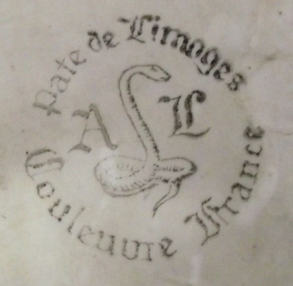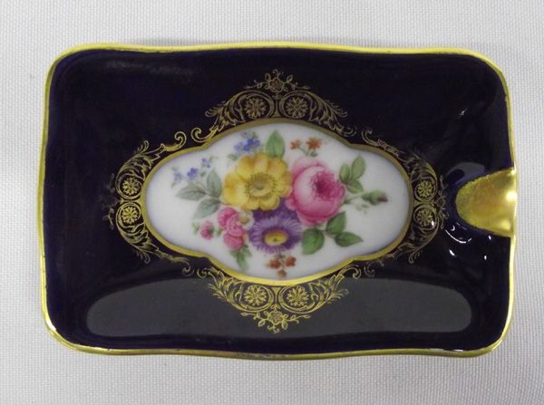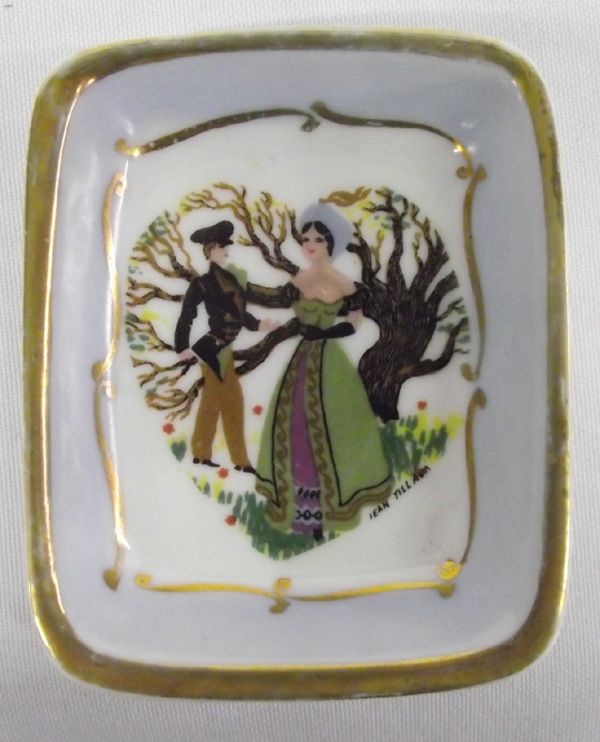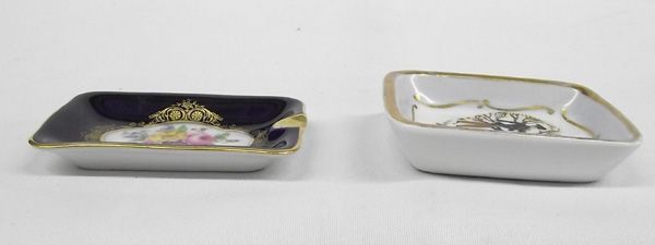Pair of China Dishes- Ring Holder and Ash Tray. 1) The ring dish is ''Pate de Limoges'' marked AL with snake, Couleuvre, France. It is small, rectangular dish with a painted couple in a heart design. Measures 2.75'' x 3.25''. 2) The small German Porcelain ash tray is Hutschenreuther from Honenberg, Germany and measures 3.5'' x 2.25''.