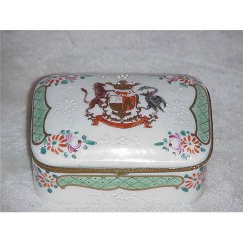 A hand painted limoges porcelain box, 5" long, 3 1/2" wide, 2 1/4" tall. Painted with a crest and crown on the lid with raised slip decoration. Condition is very good, no chips, cracks or repairs. (2).