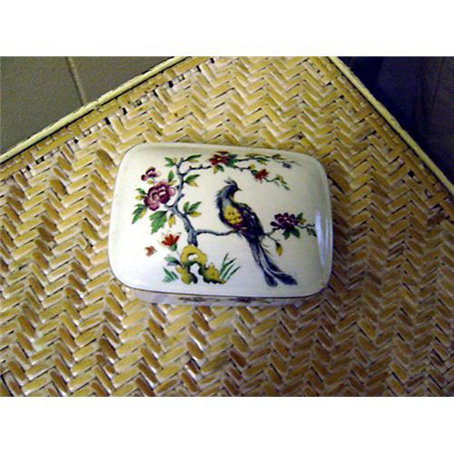 This box measures 4 7/8" long (with lid) and 3 5/8" wide. The lid is adorned with colorful landscape. There is a long-feathered bird standing on a branch with vibrant colored flowers