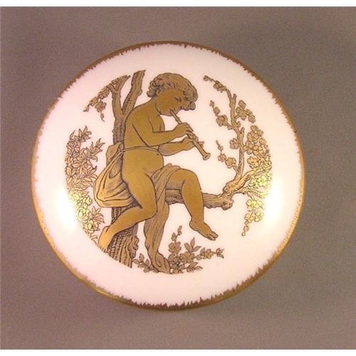 Limoges Cherub Trinket Box. The image on the lid is gold leaf. The mark on the bottom indicates that it was produced between 1892 and 1907.