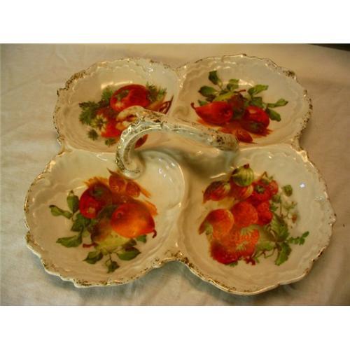 Beautiful Limoges 4-section plate with center handle. Fruit painted in each section. Hand painted with gold trim. No visible defects. Wear commensurate with age.