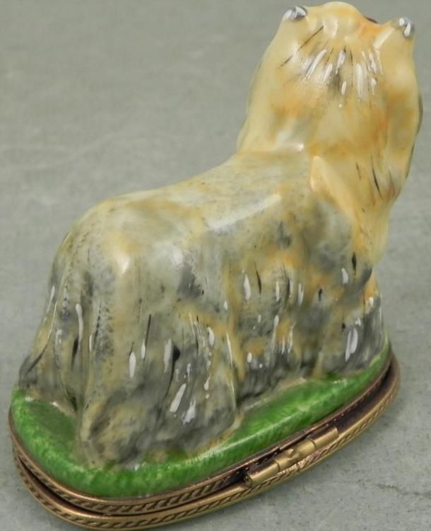 The adorable dog on this Limoges hinged box has a red bow, and you'll see it again inside. * Maker: Limoges, Chamart, France * Dimensions: 2 1/2 inches tall * Condition: Excellent