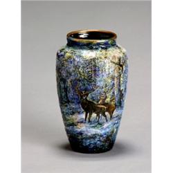 Limoges Enamel Winter Landscape Vase, Circa 1900, Depicting stags in a forest, a castle in th...