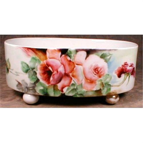 This Limoges oval dish with ball feet is intended for displaying ferns and is called a ferner. It has very pretty hand painting and is decorated with gold.