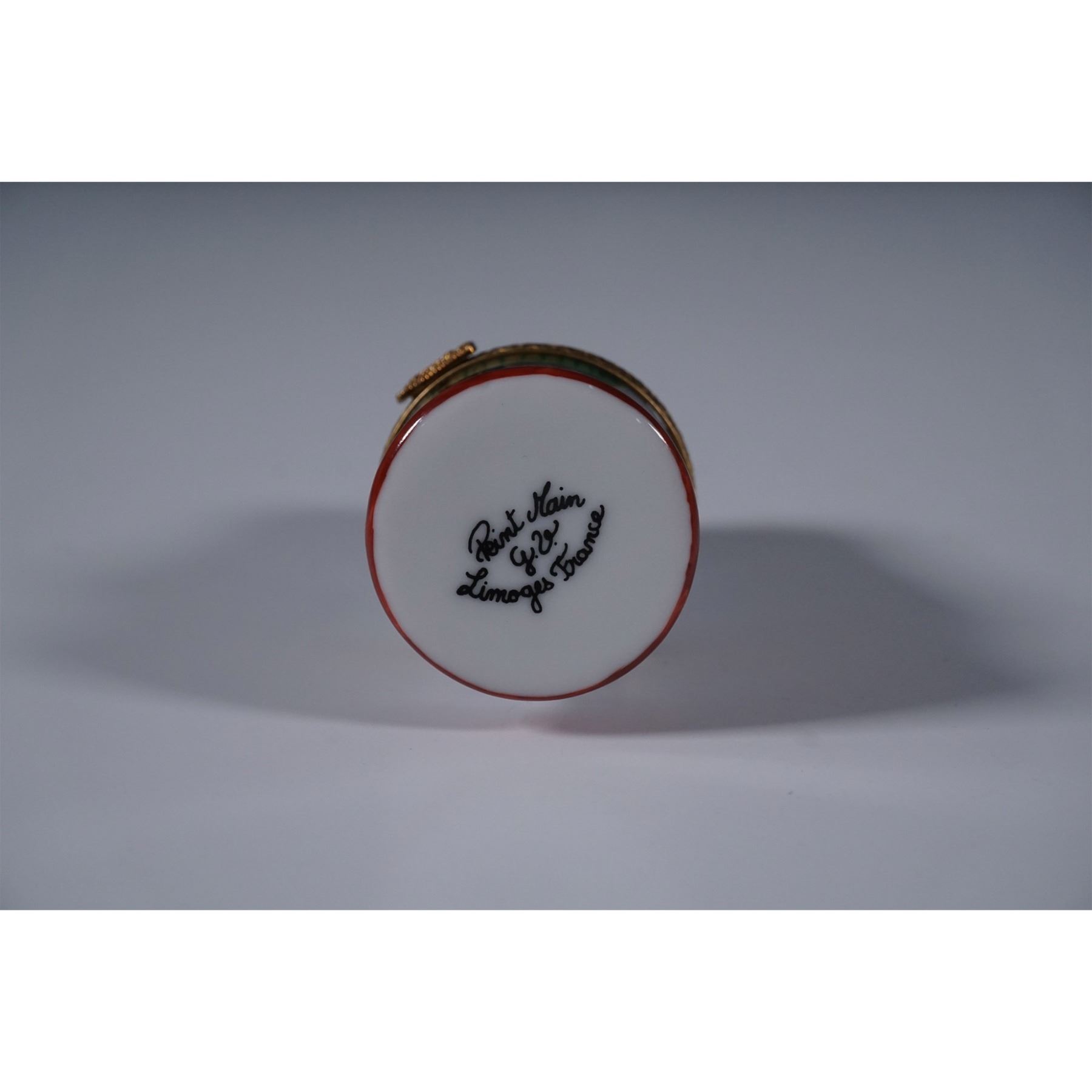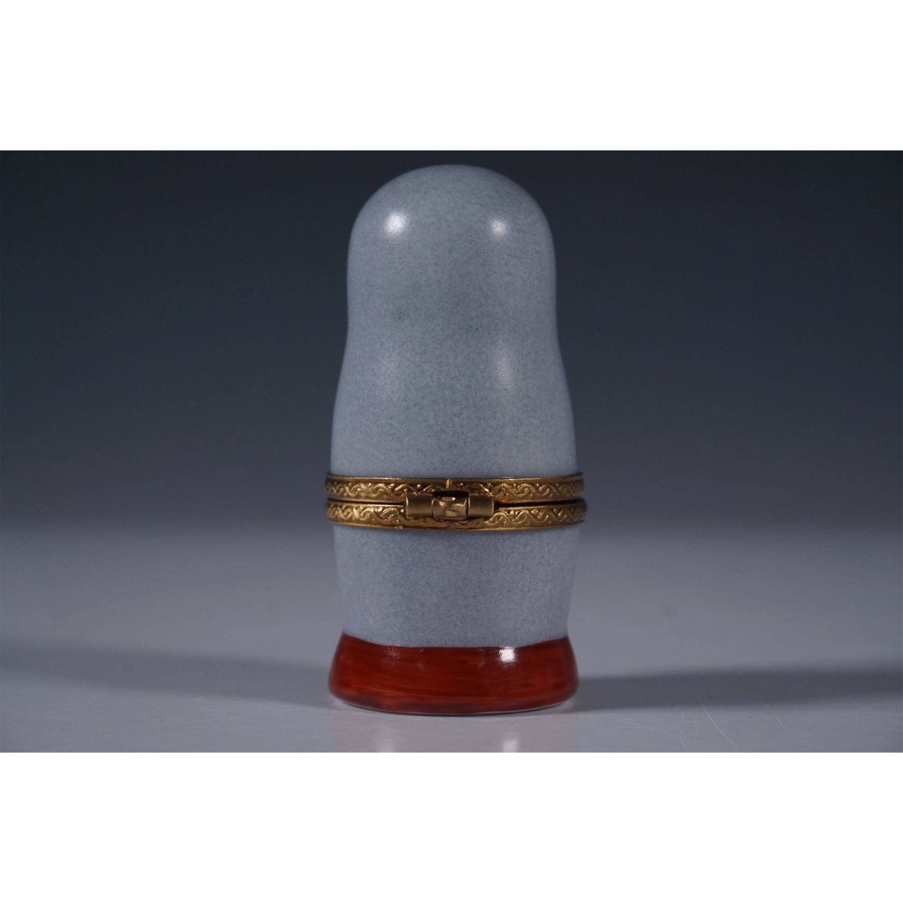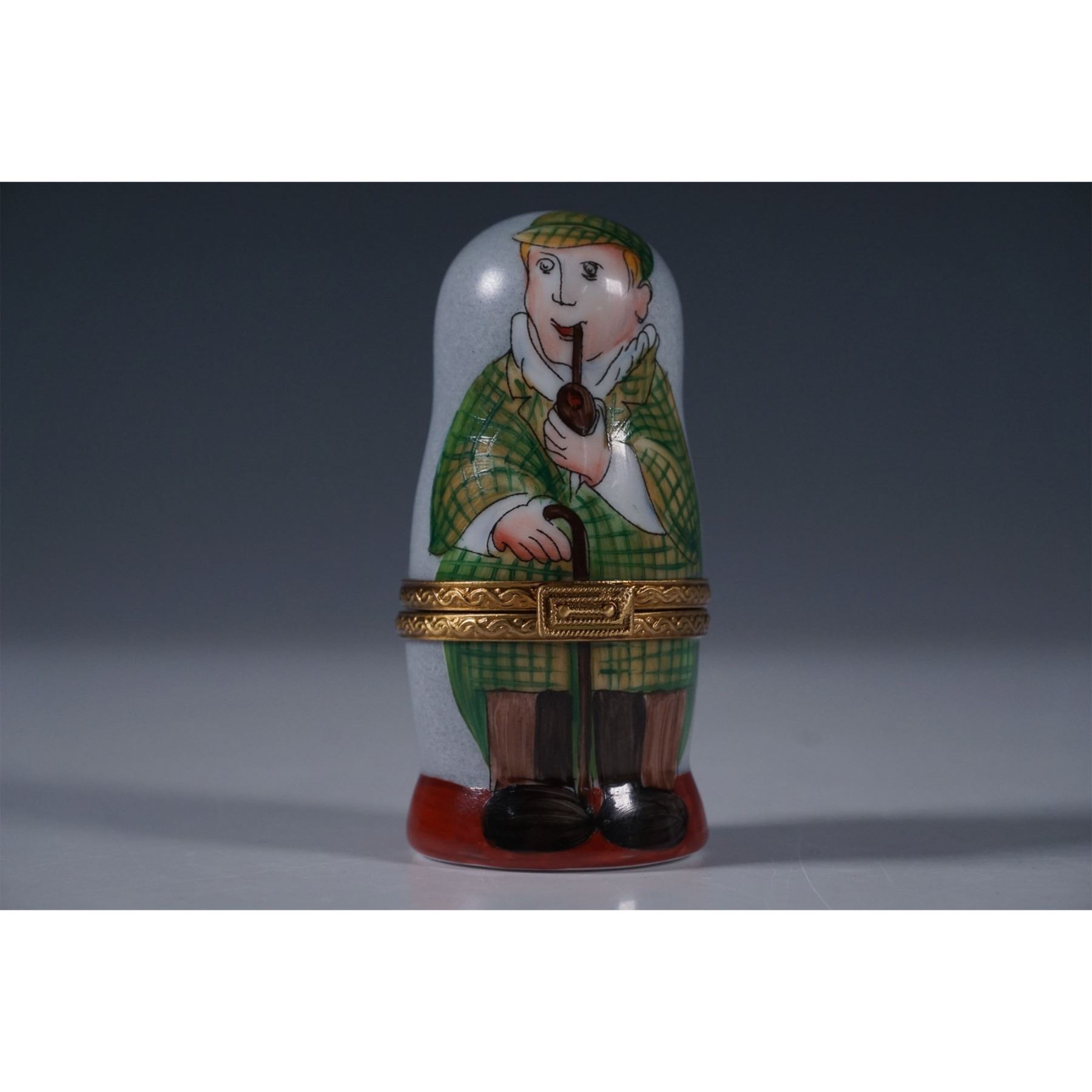 Hand-painted Limoges porcelain figurine box featuring a nesting doll design inspired by Sherlock Holmes. The hinged box opens to reveal two smaller figurines, including Dr. Watson and a miniature magnifying glass. The exterior showcases Holmes in his iconic green plaid attire with a pipe and cane, while the interior figures are finely detailed. Marked Peint Main, Limoges France on the base, indicating authentic hand-painted craftsmanship from Limoges. Enhanced with a decorative gilt metal clasp.