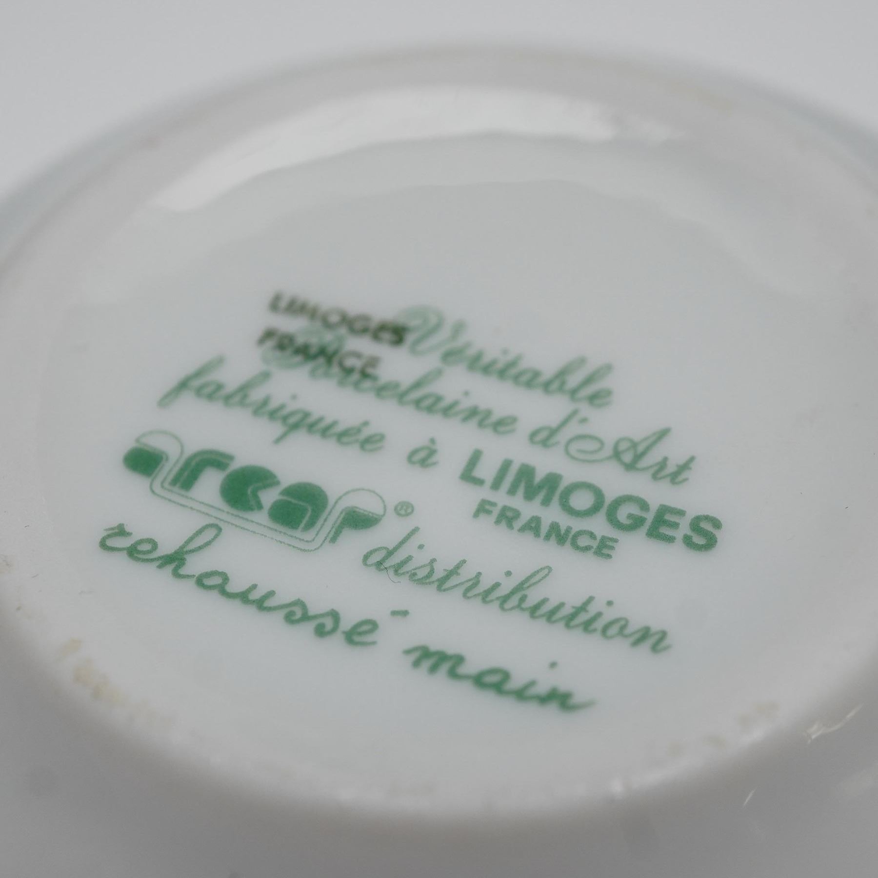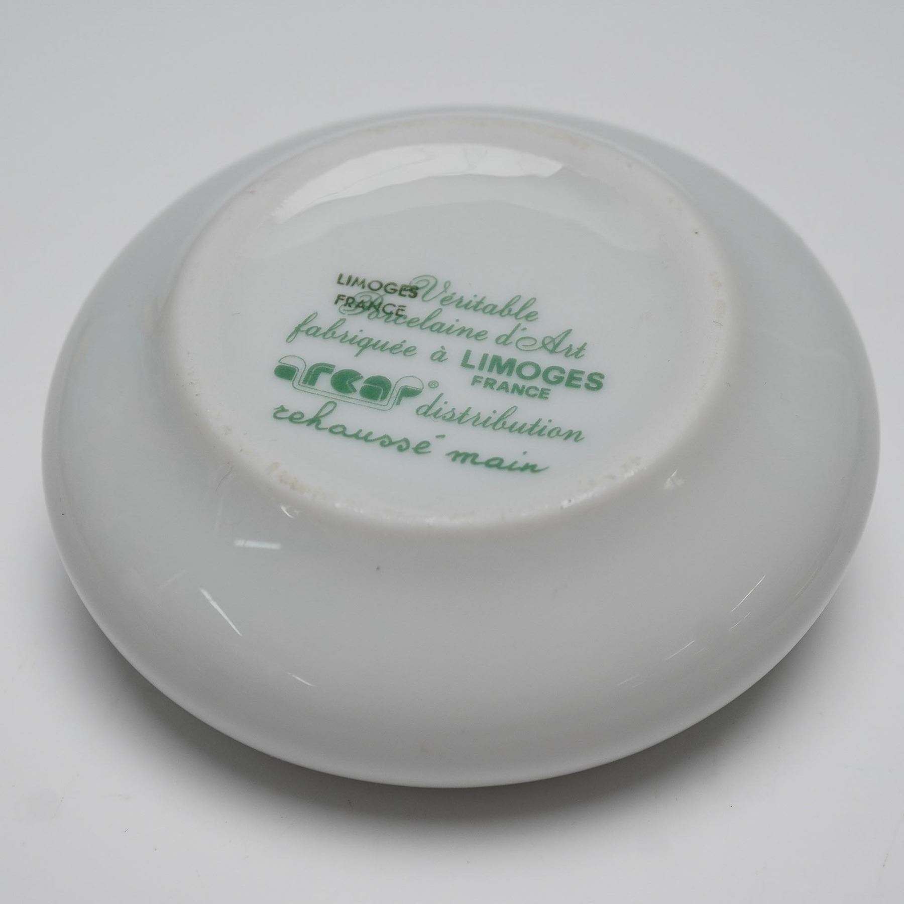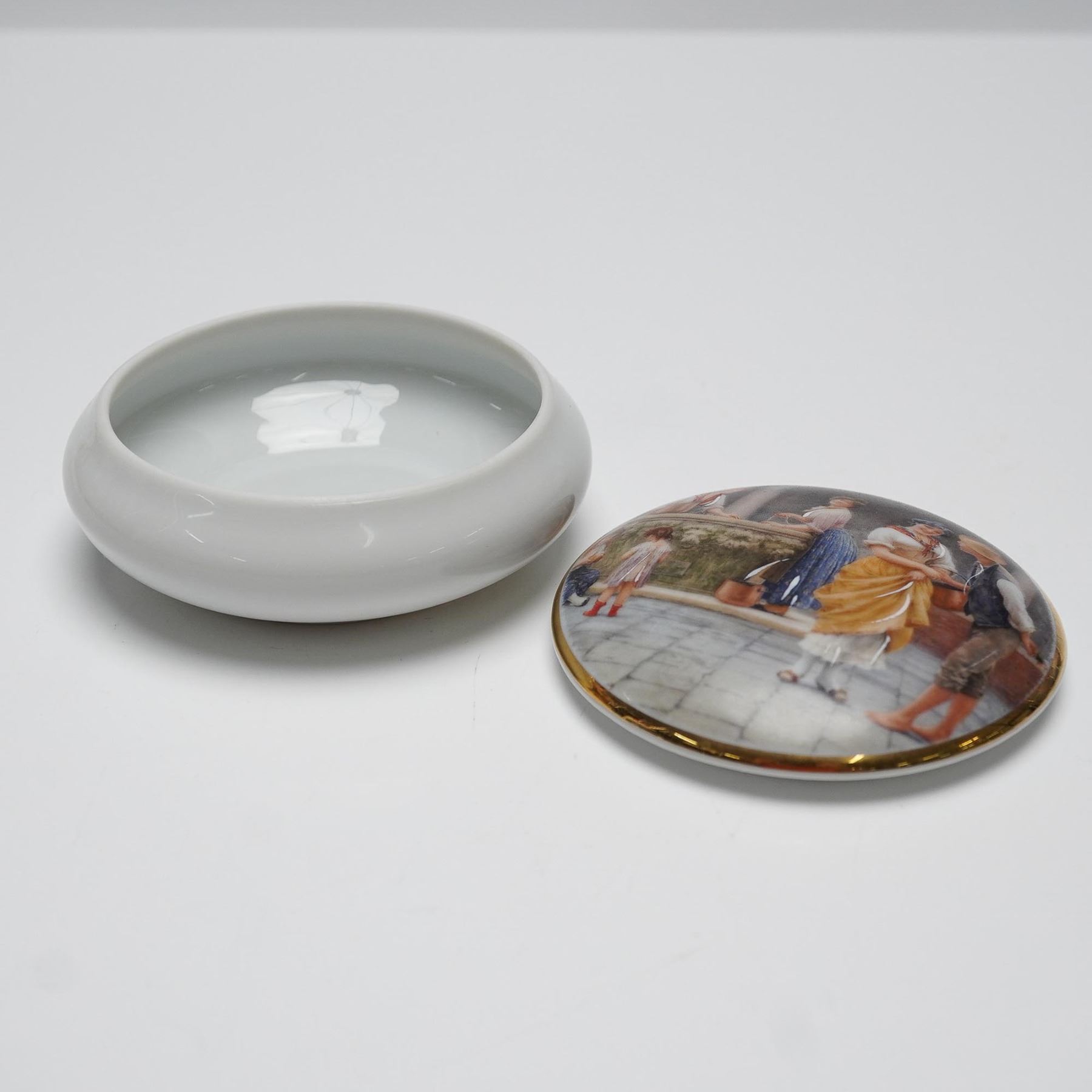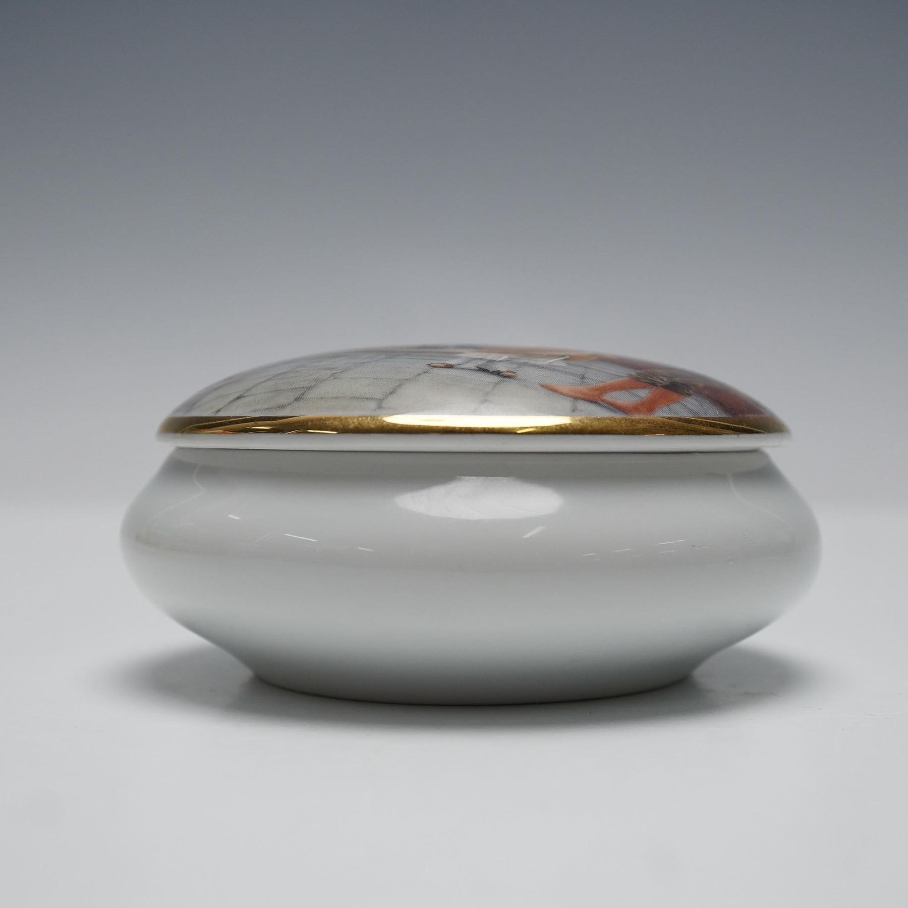 Porcelain covered trinket or powder box by Arcap Limoges, France. The domed lid features a finely detailed scene of figures in traditional attire gathered in a European courtyard, rendered in rich colors and bordered with a hand-painted gilt rim. The underside is marked Limoges Véritable Porcelaine d'Art fabriquee a Limoges France, Arcap distribution, rehausse-main, indicating authentic hand-embellished Limoges porcelain. A classic example of French decorative porcelain craftsmanship.