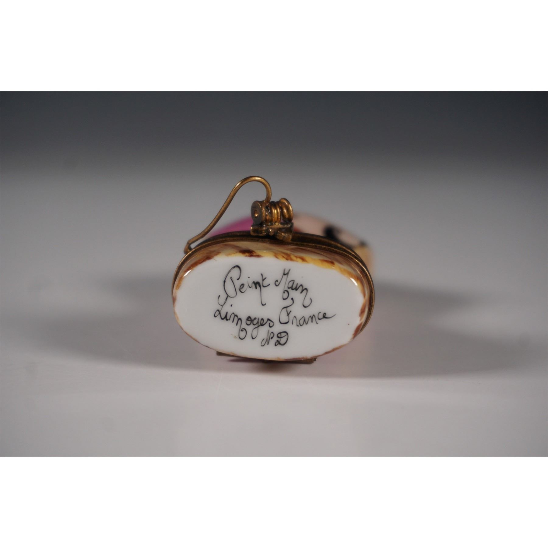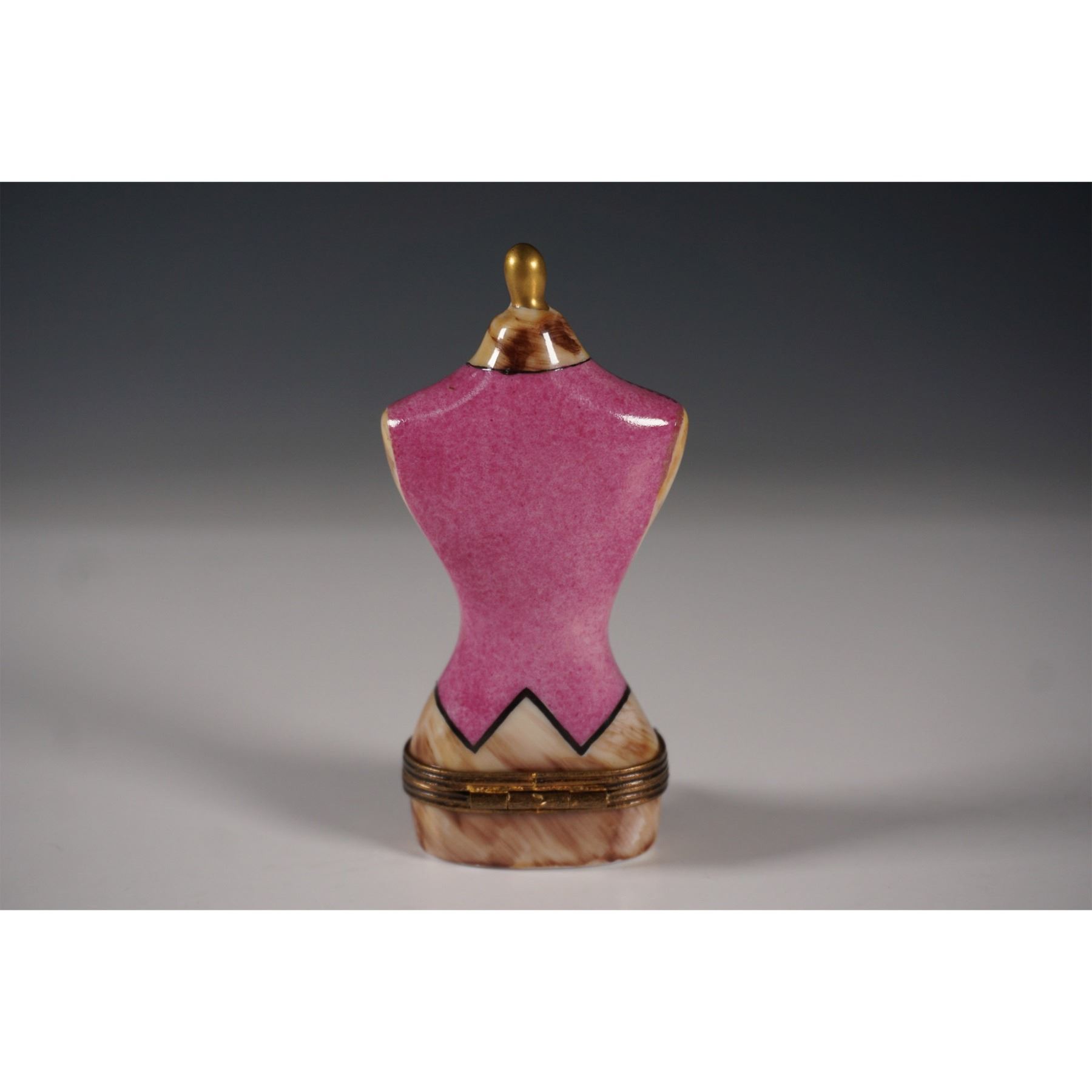 Hand-painted Limoges France porcelain trinket box in the shape of an Art Deco-style mannequin. This intricately designed box features a stylized female face in bold black, pink, and tan hues, with gold-tone metal accents and a decorative clasp. The interior is hinged, allowing for small keepsakes to be stored inside. A button is drawn on the inside, adding a charming detail. Marked on the base Peint Main Limoges France indicating it is hand-painted in Limoges, a region renowned for its fine porcelain craftsmanship.