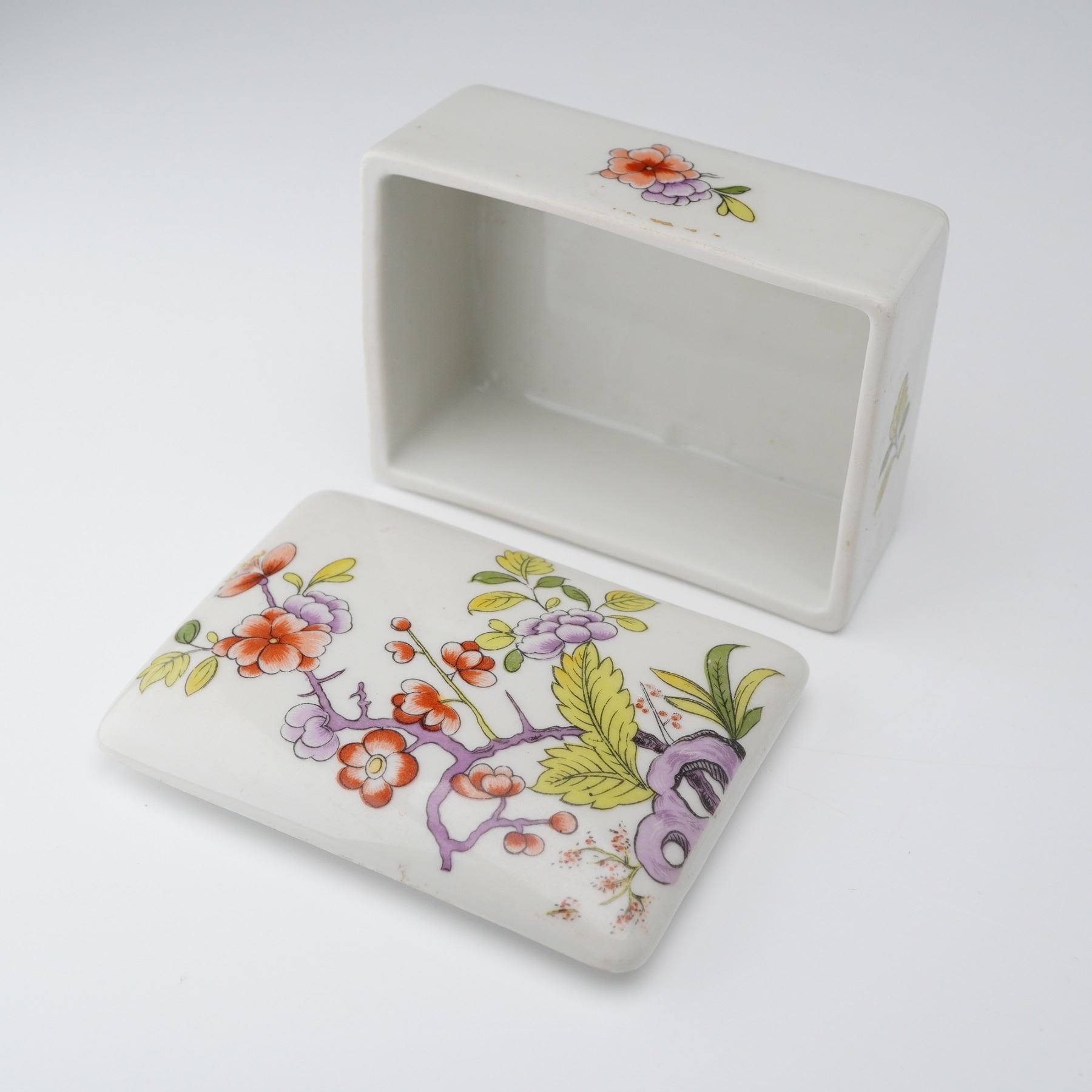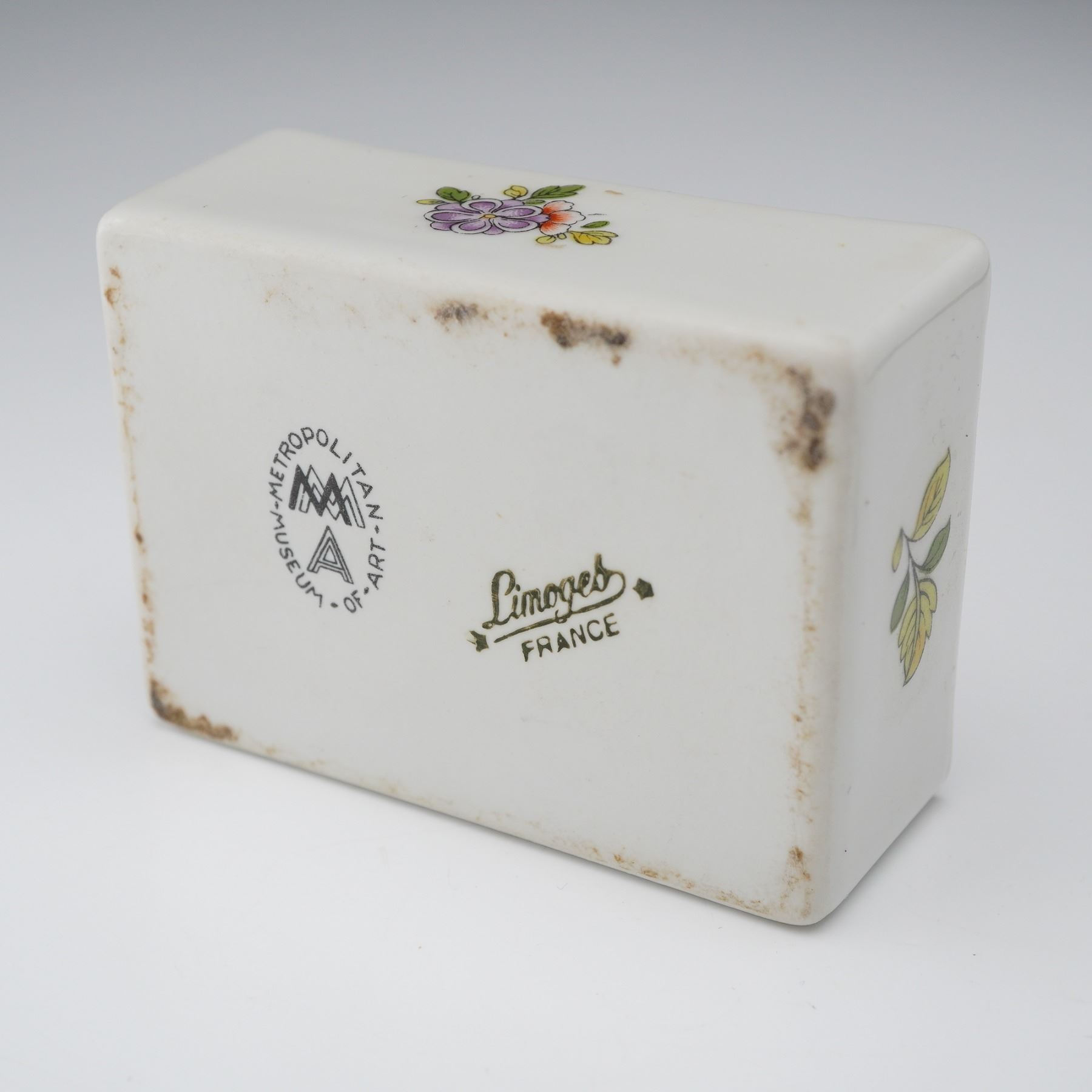 This elegant Limoges France floral lidded ring box features a charming floral design in vibrant shades of purple, orange, and green. The delicate pattern wraps around the top and sides of the porcelain box, offering a refined touch of sophistication. With the Limoges France mark and a Metropolitan Museum of Art stamp, this piece makes an exquisite addition to any collection. Ideal for storing rings or other small keepsakes.