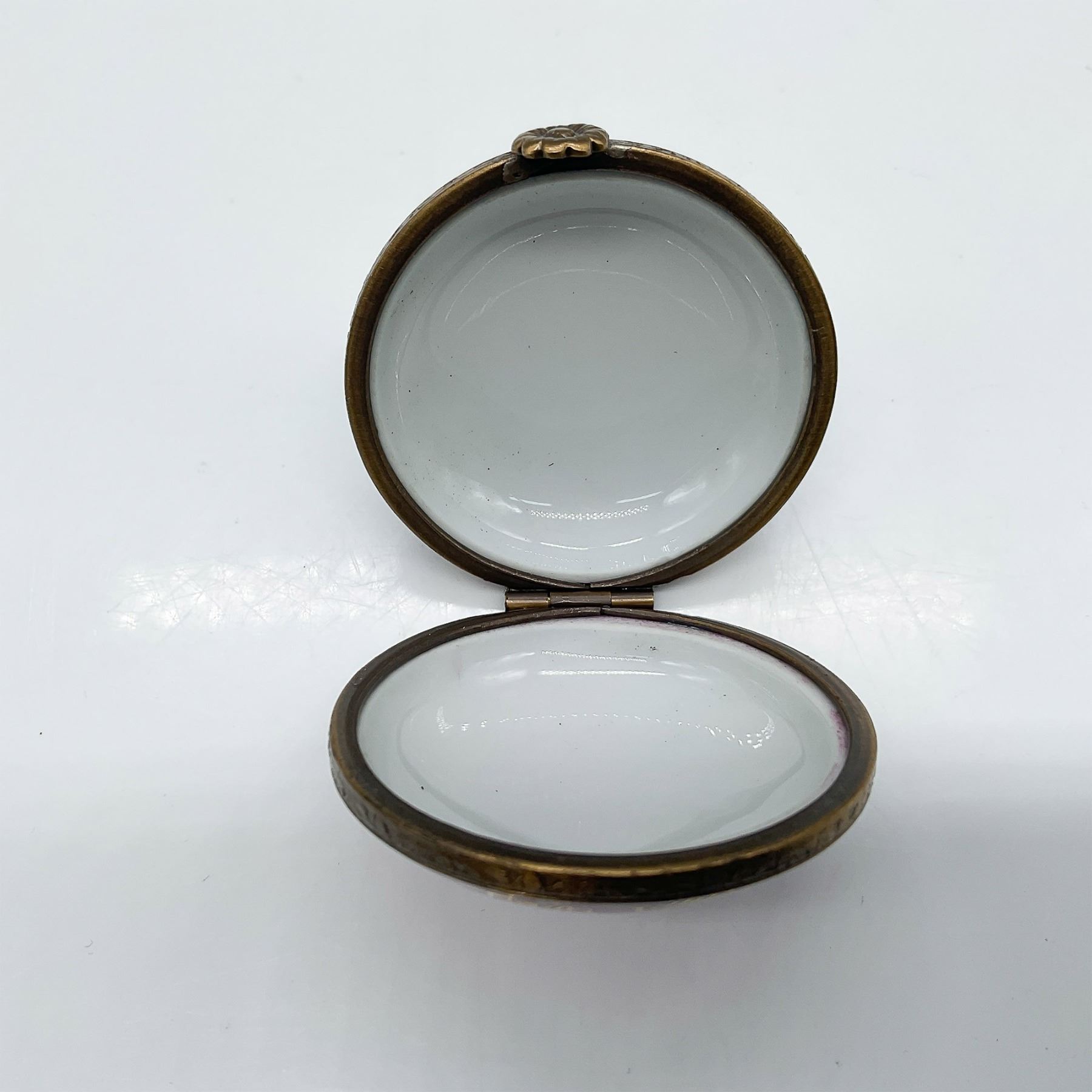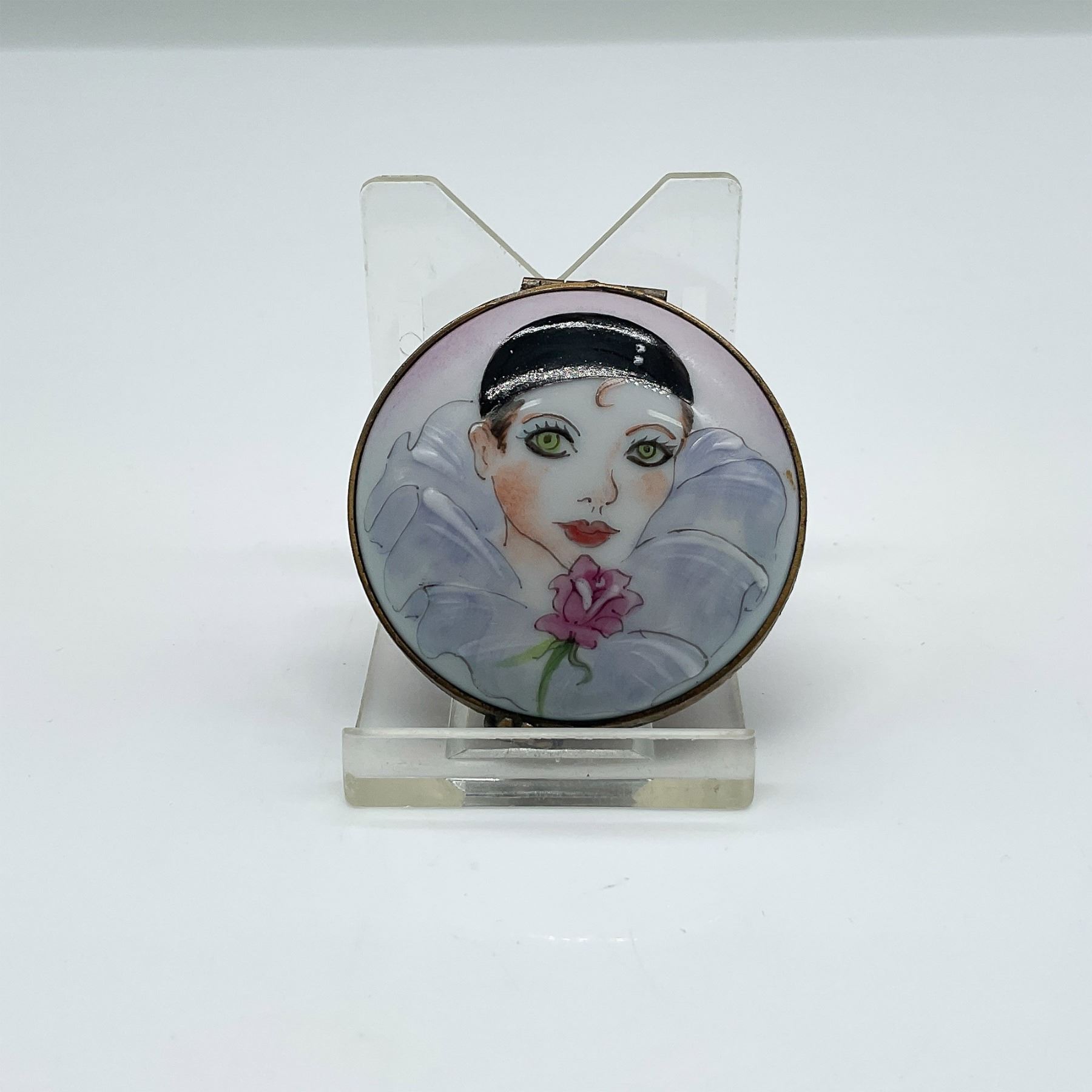 Elegant Limoges porcelain trinket box featuring a hand-painted Art Deco-style portrait of a Pierrot figure holding a pink flower. The delicate pastel hues, finely detailed facial features, and shimmering accents on the headpiece highlight the craftsmanship. The hinged box is set within a gilt metal frame with a decorative clasp. The reverse side is signed Peint Main Limoges France, confirming its authenticity as a hand-painted piece from the renowned French porcelain region. The interior is a glossy white porcelain finish.
