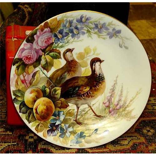Outstanding large hand painted porcelain Limoges France wall charger. The plate depicts two wonderful birds amongst floral blossoms and fruits. Great use of color, and brushwork! Artist signed on the plate as well as the underside Limoges Flambeau France. Measuring 12? inches in diameter. This fantastic charger would make a wonderful gift or addition to any fine household.