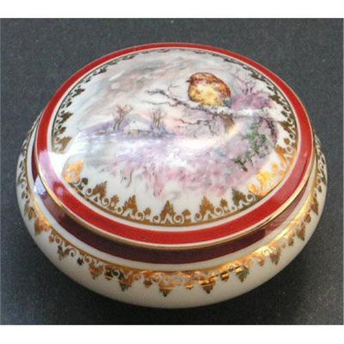 This lovely LIMOGE FRANCE dresser jar features a lid depicting a winter on a farm, mountains behind, snow everwhere and a lovely golden bird, sitting on a branch, in the foreground. Copious god trim and a red border. The bas is white decorated with gold. Marked on the bottom - LIMOGES FRANCE and the P. Cie seal. Measuring 2 inches tall x 4 1/4 inches across the middle - with both the lid and jar in excellent condition.