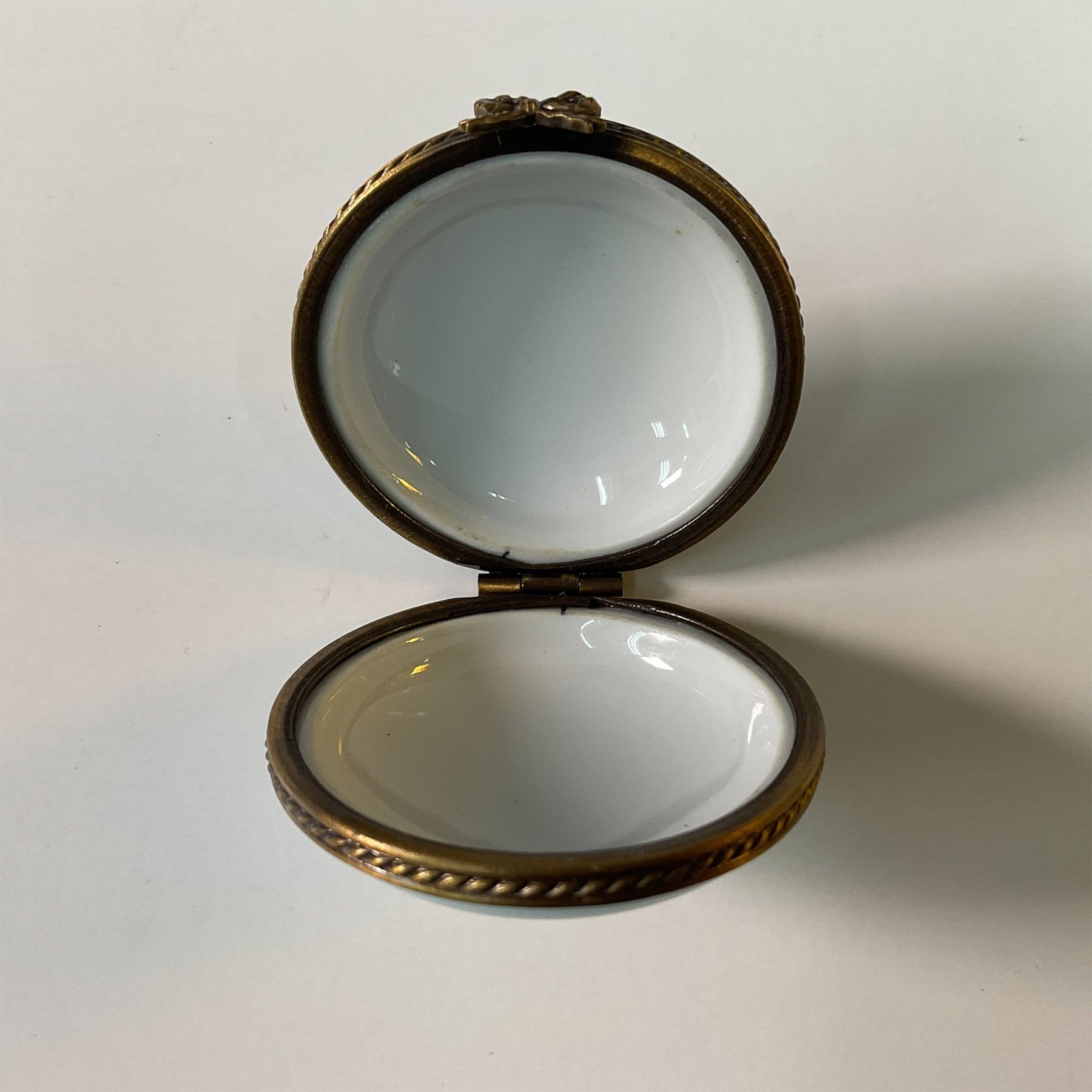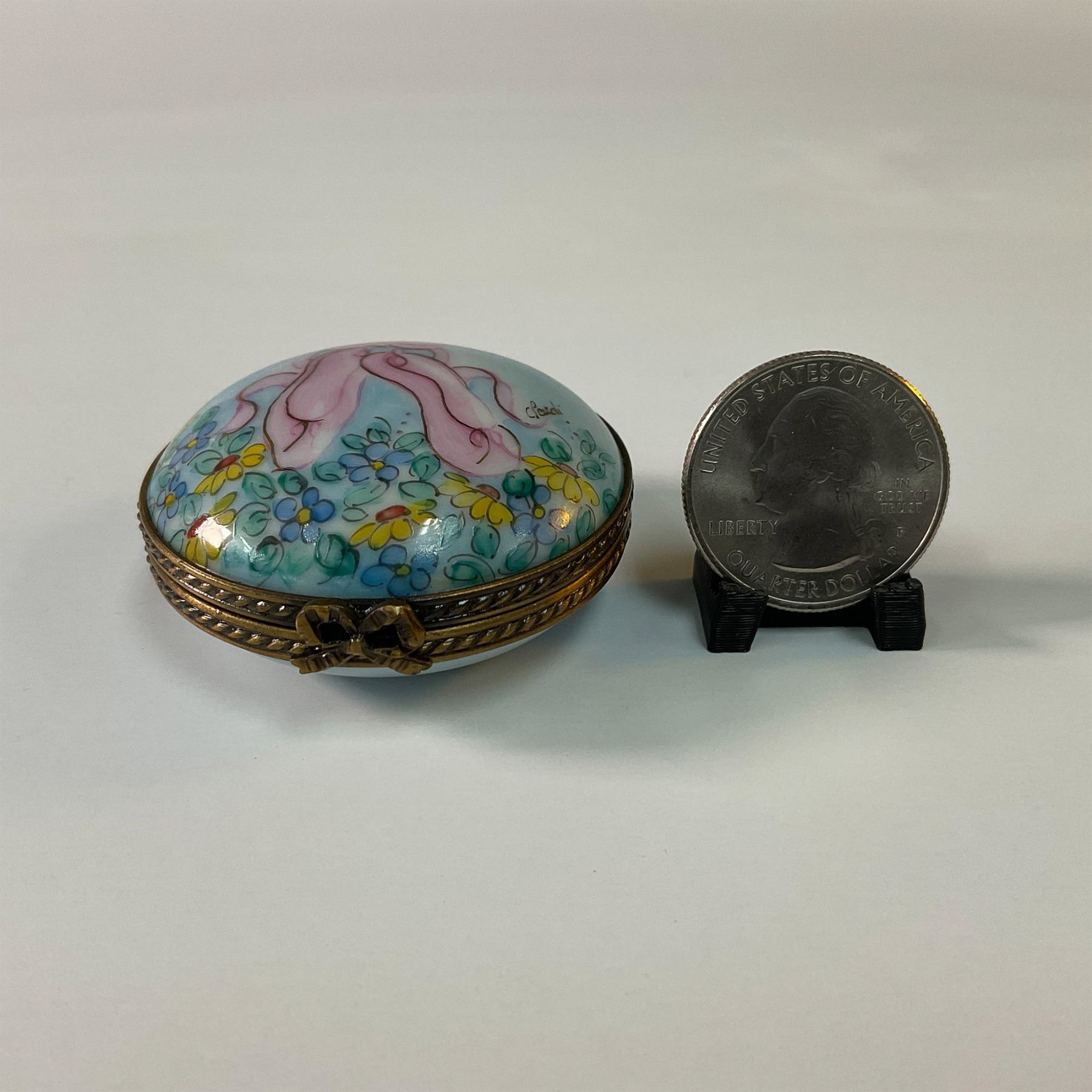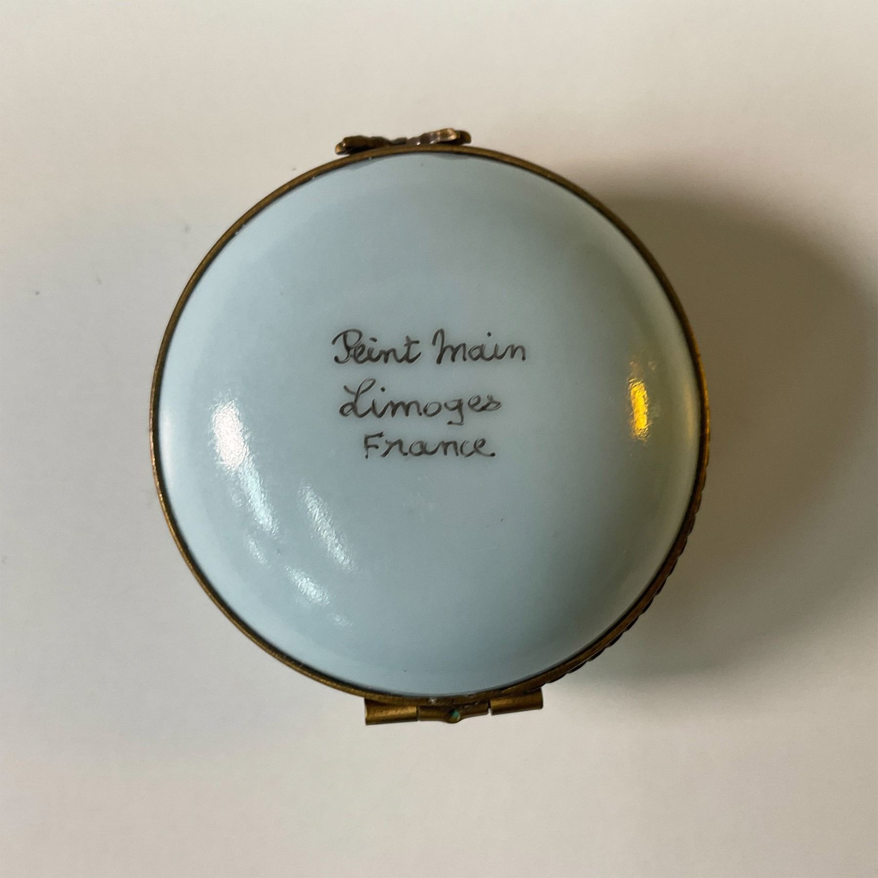 Elegant porcelain treasure box, handcrafted in Limoges, France. This round box features a beautifully hand painted design of pink ballerina slippers tied with ribbons, surrounded by colorful floral accents. The soft pastel blue background enhances the delicate artistry and charm of the piece. The hinged box opens to reveal a pristine white interior, showcasing the timeless craftsmanship of Limoges porcelain. A perfect collectible for ballet enthusiasts, art lovers, or those who appreciate fine French porcelain. Marked Limoges, France. Artist signed.