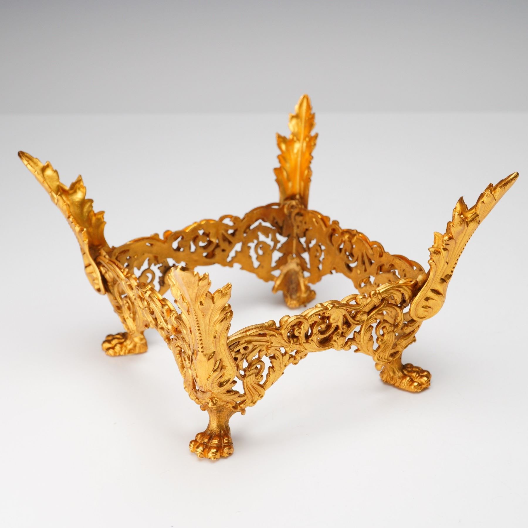 Elegant Limoges porcelain bowl, beautifully hand painted with a floral motif in rich shades of blue, green, and orange, framed by intricate gilt detailing and patterned panels. The square-shaped bowl features flared sides and a lustrous gold rim. The piece sits within an elaborate French ormolu stand, decorated with acanthus leaf scrollwork and claw feet in high Rococo style. The bowl is marked Porcelaine Limoges France, Peint la main, and is hand-numbered 6836/4460 to the base. Measures 6"L x 4"H.