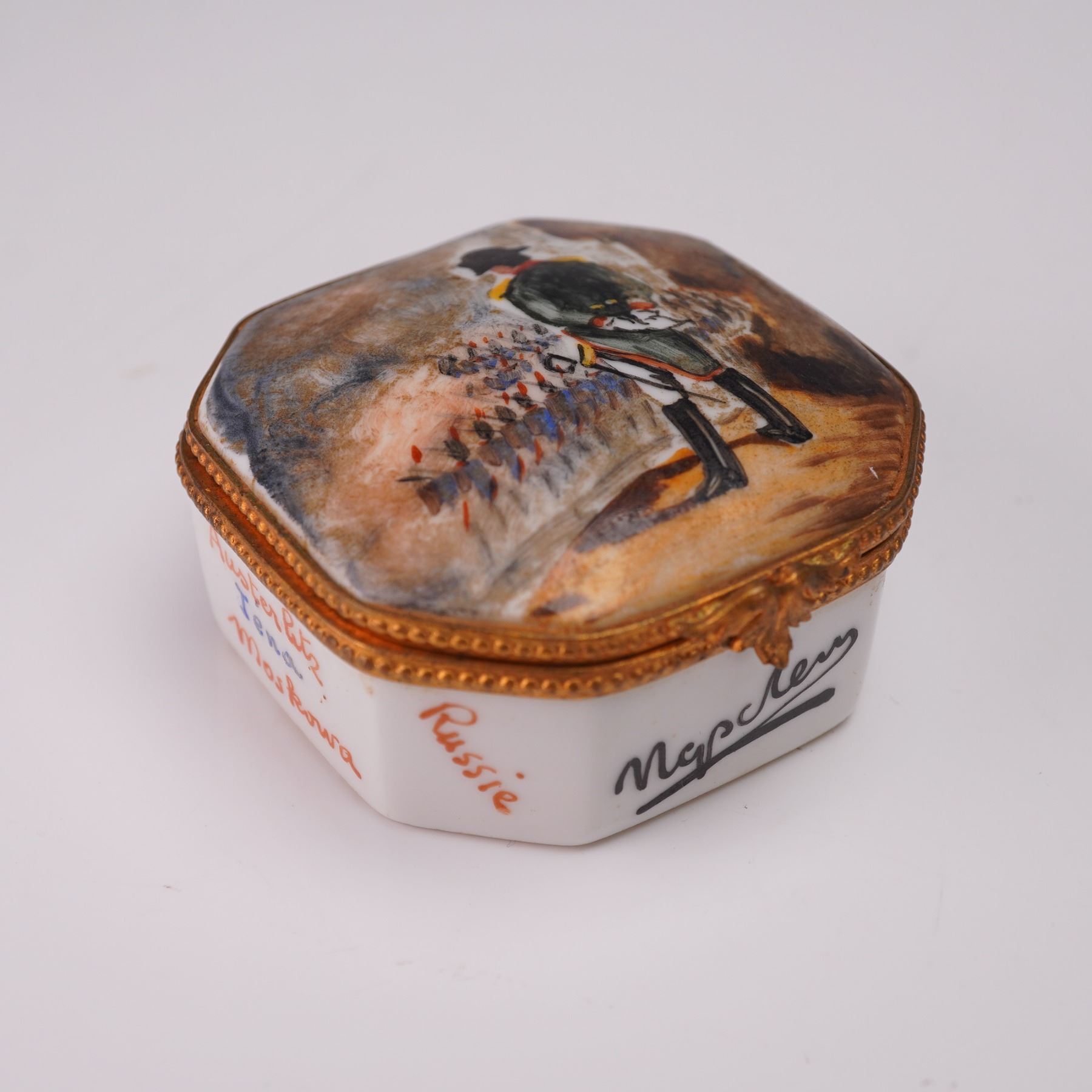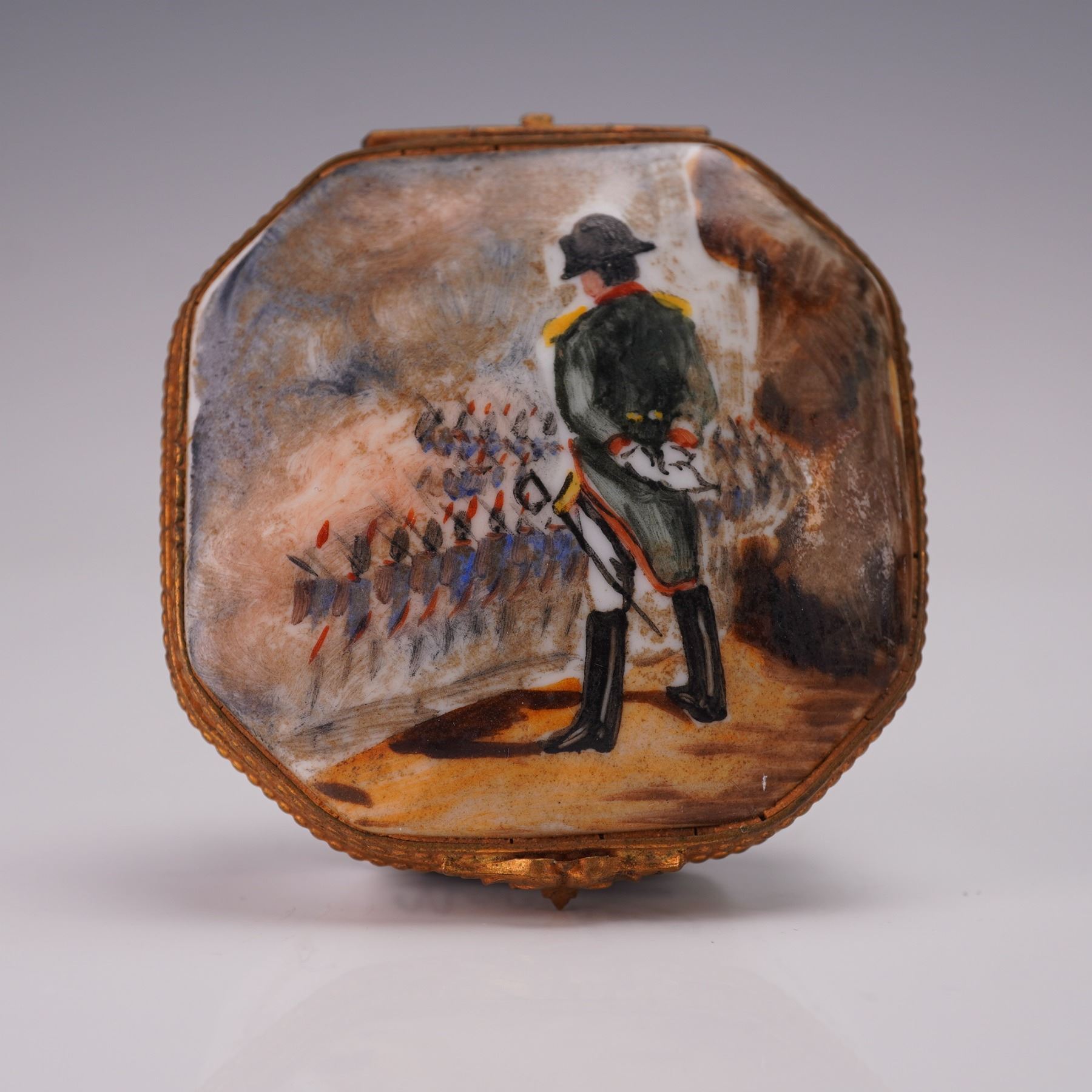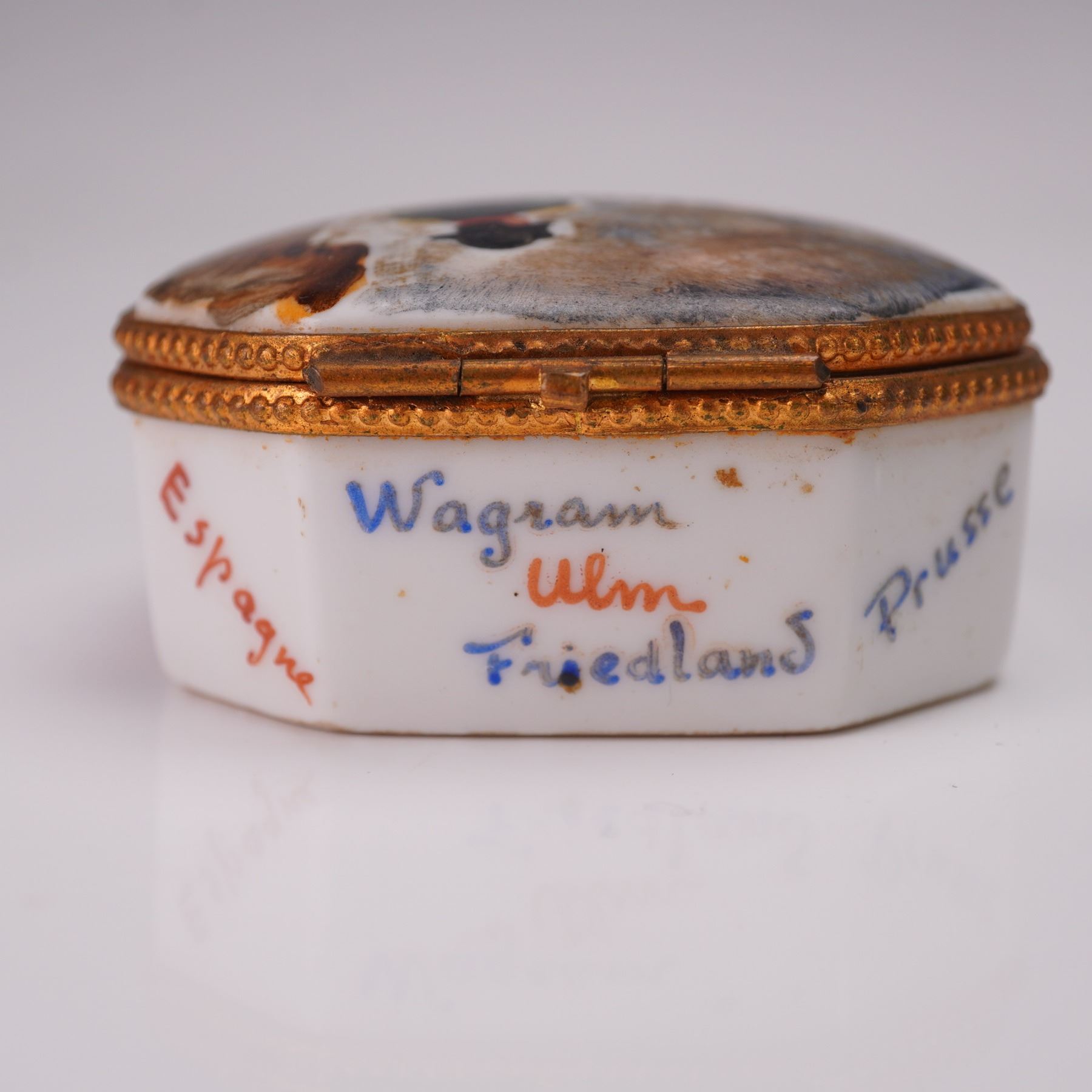 Hand painted Limoges porcelain box depicting Napoleon standing before his troops, surrounded by the names of significant battles including Austerlitz, Wagram, and Friedland. The octagonal form is adorned with gilt metal mounts and artist initials E.G. on the base. The interior is left plain white. This collectible piece captures a detailed military scene in rich, painterly colors. Made in France.