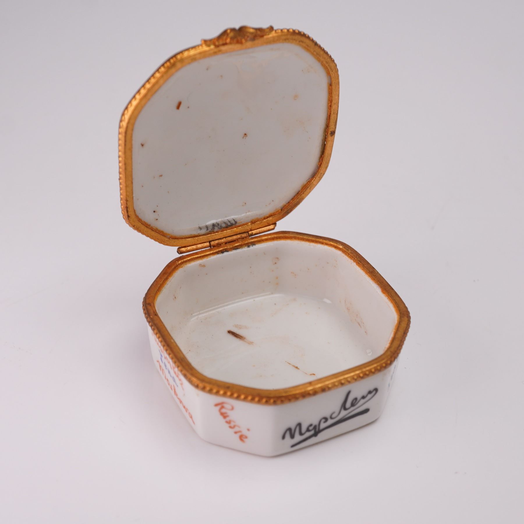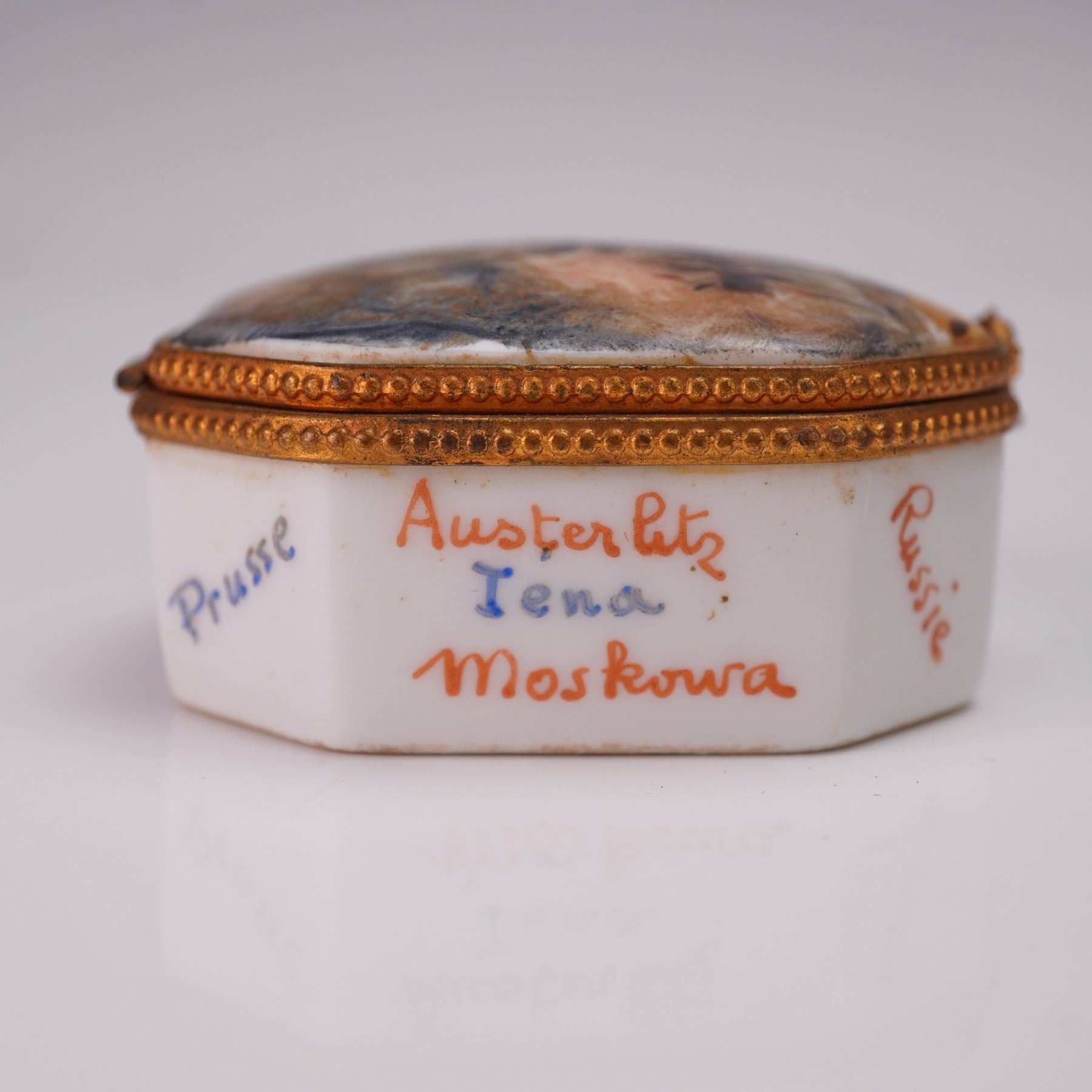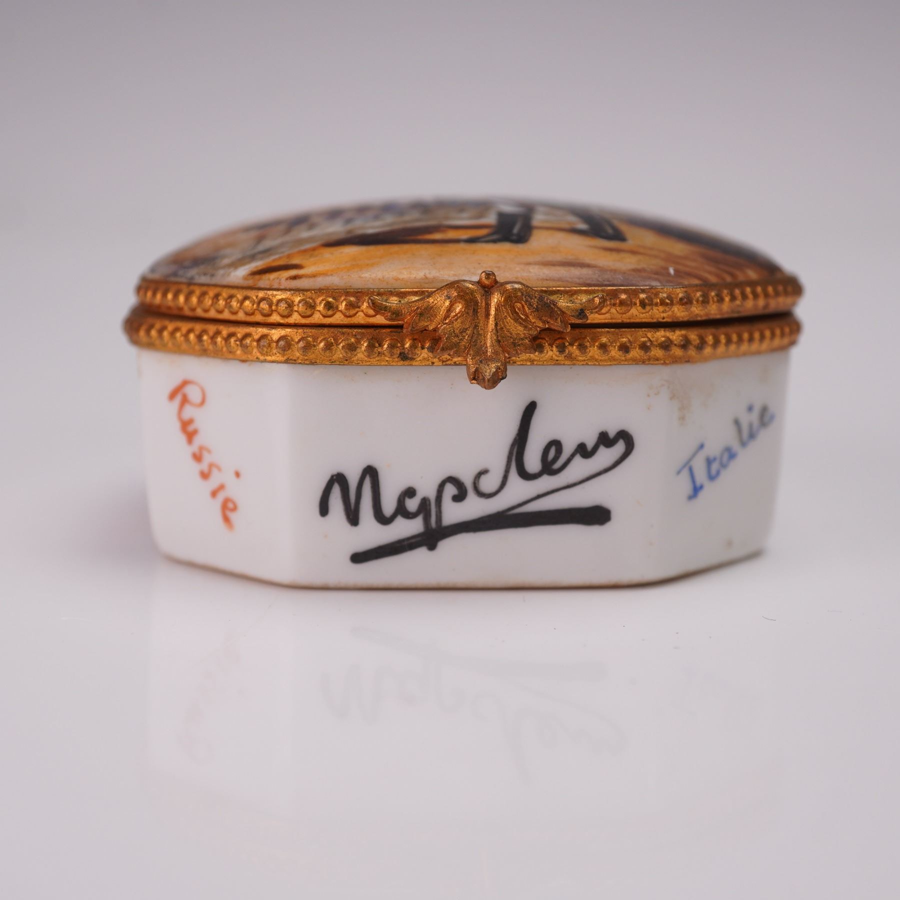 Hand painted Limoges porcelain box depicting Napoleon standing before his troops, surrounded by the names of significant battles including Austerlitz, Wagram, and Friedland. The octagonal form is adorned with gilt metal mounts and artist initials E.G. on the base. The interior is left plain white. This collectible piece captures a detailed military scene in rich, painterly colors. Made in France.