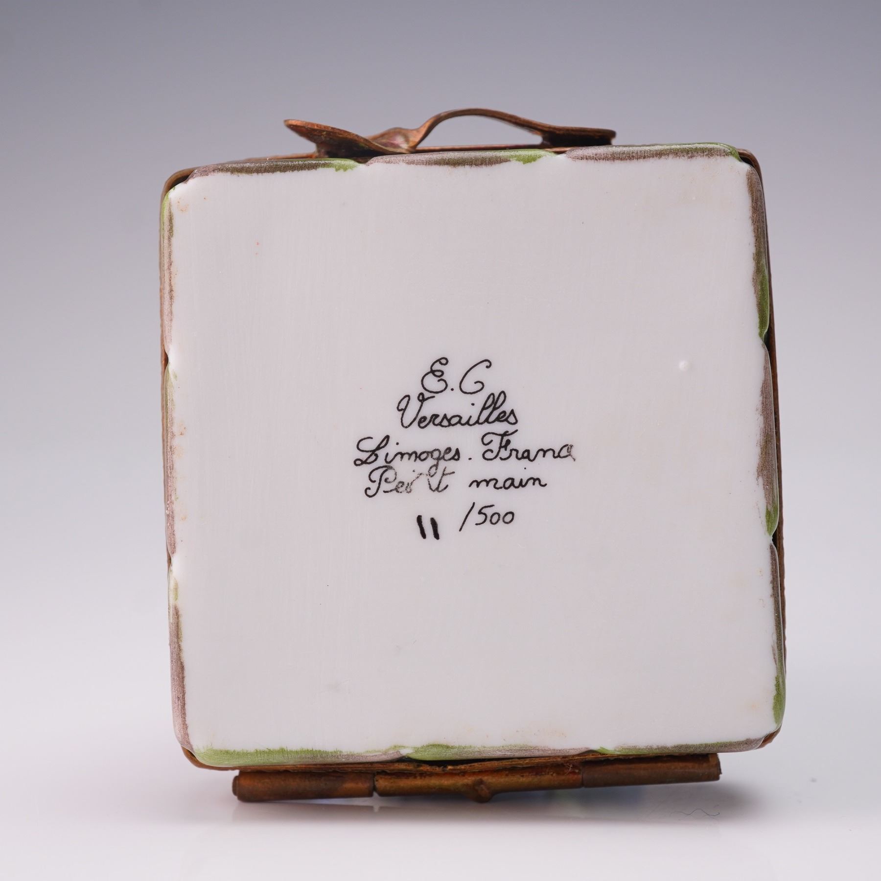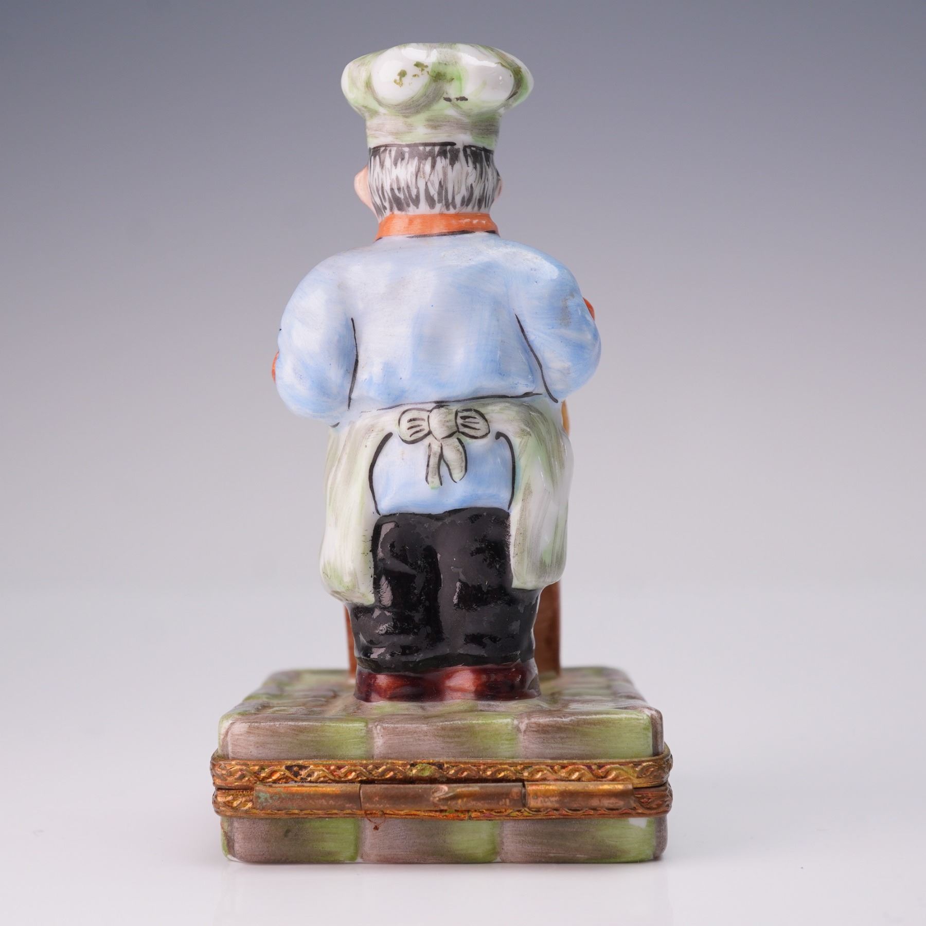 Hand-painted Limoges porcelain hinged box from EC Versailles features a cheerful chef figurine holding a French menu with a hanging duck. The base opens to reveal a painted scroll with Aux Tord Boyaux and is signed on the underside. Includes original The Cottage Shop gold storage box. Measures 1.75"L x 3.25"H. Box measures 4.25"W x 4.25"L.