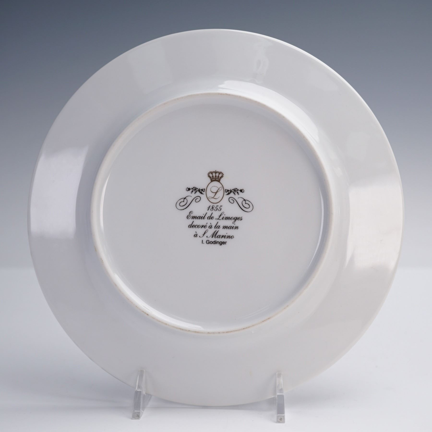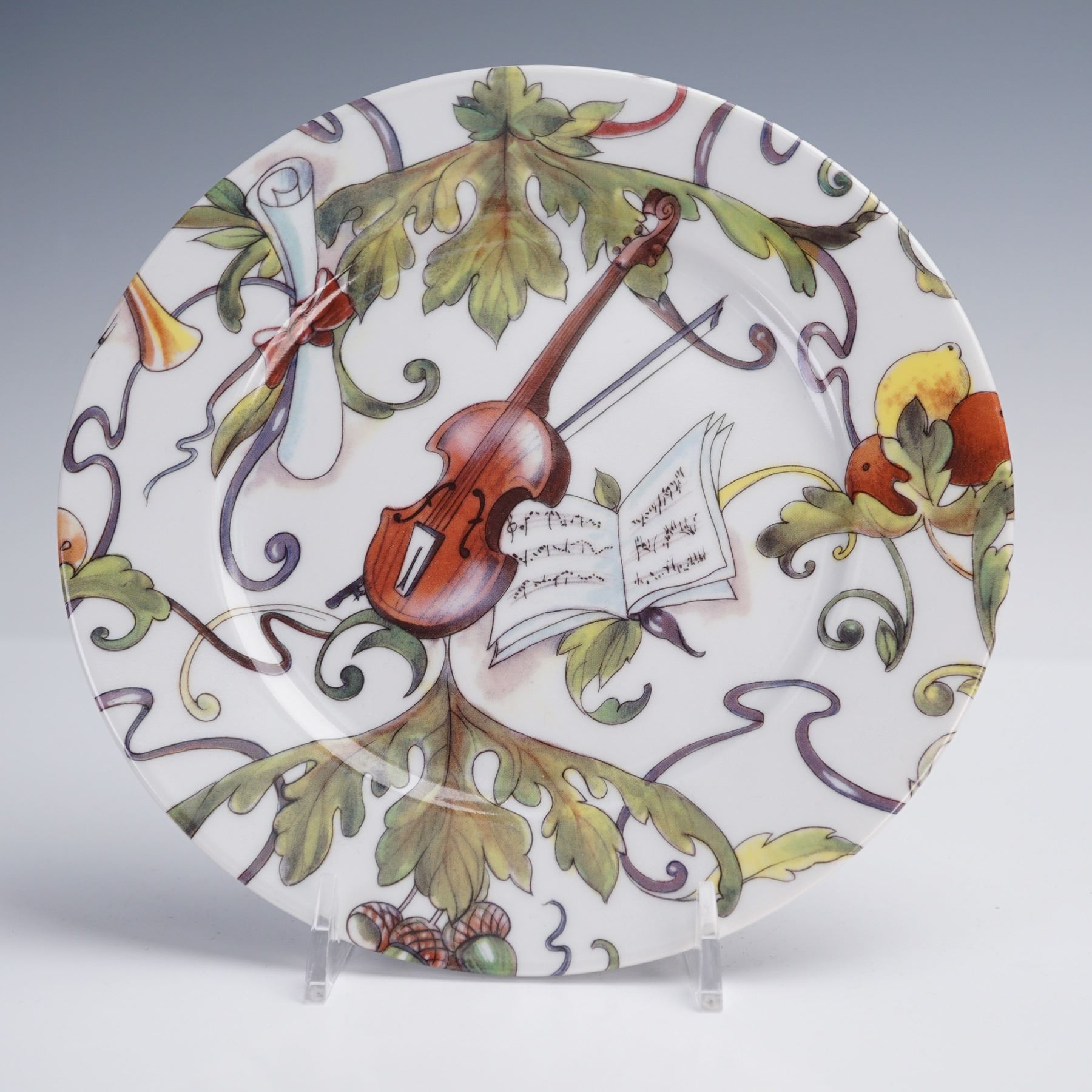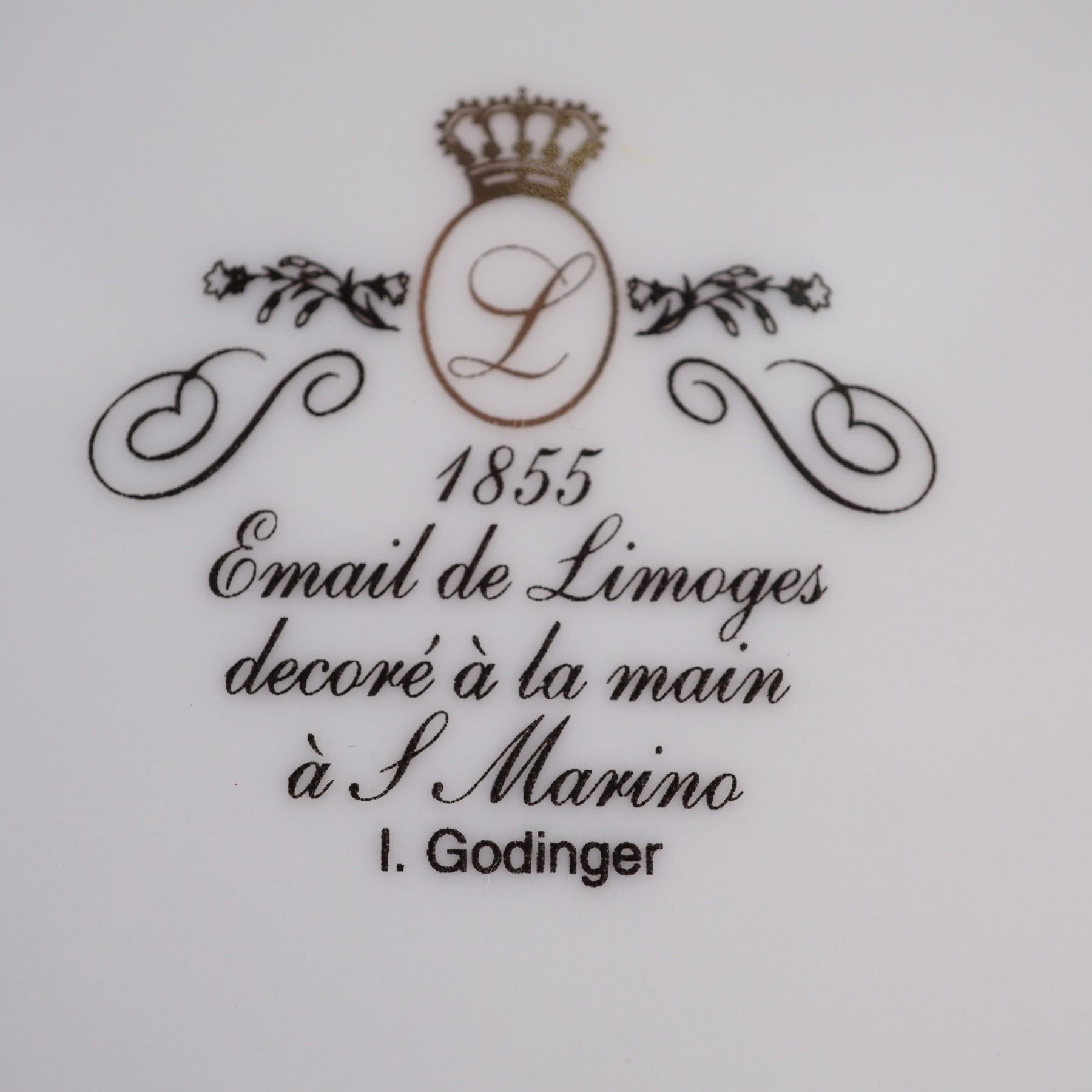 A finely crafted Limoges porcelain decorative plate, richly hand-decorated with a vibrant musical motif featuring a violin, bow, and sheet music surrounded by lush scrolling foliage and fruit accents. The reverse bears the mark Email de Limoges decore a la main a S. Marino, I. Godinger, 1855, denoting the distinguished tradition of Limoges artistry. This piece exemplifies the elegance and refinement for which Limoges porcelain is renowned, blending musical symbolism with masterful hand-painted detail. A beautiful collectible plate that bridges classical design and artistic craftsmanship, perfect for display.