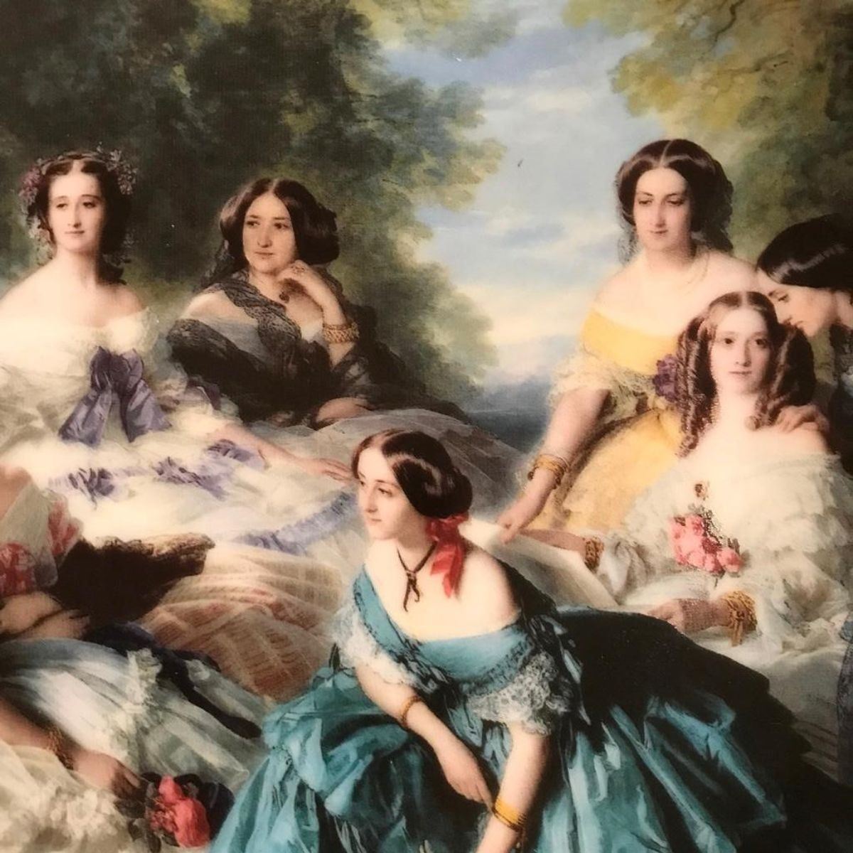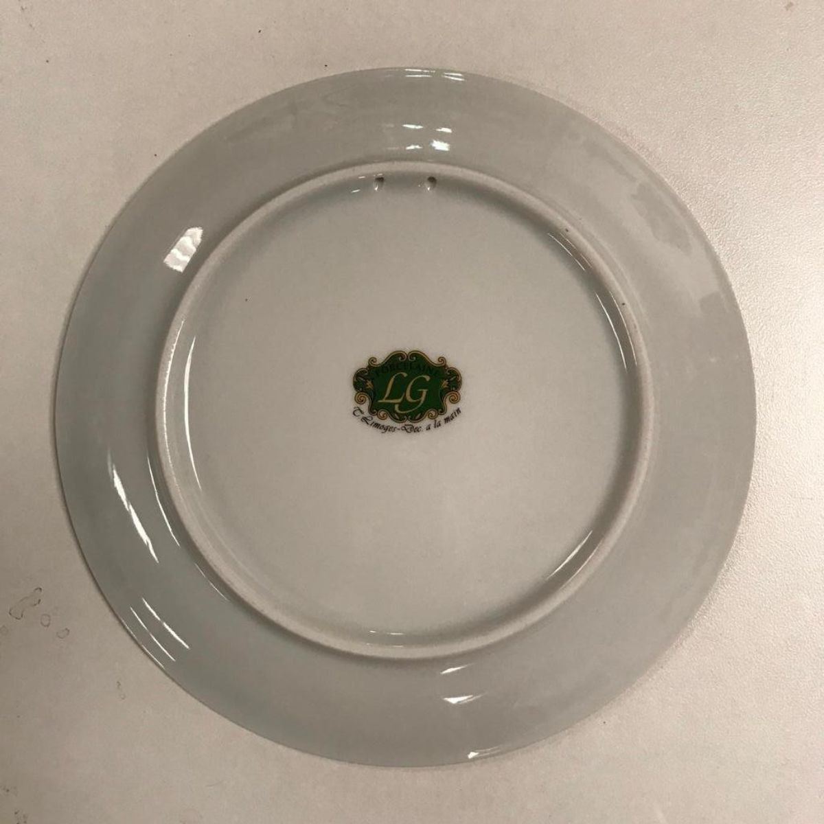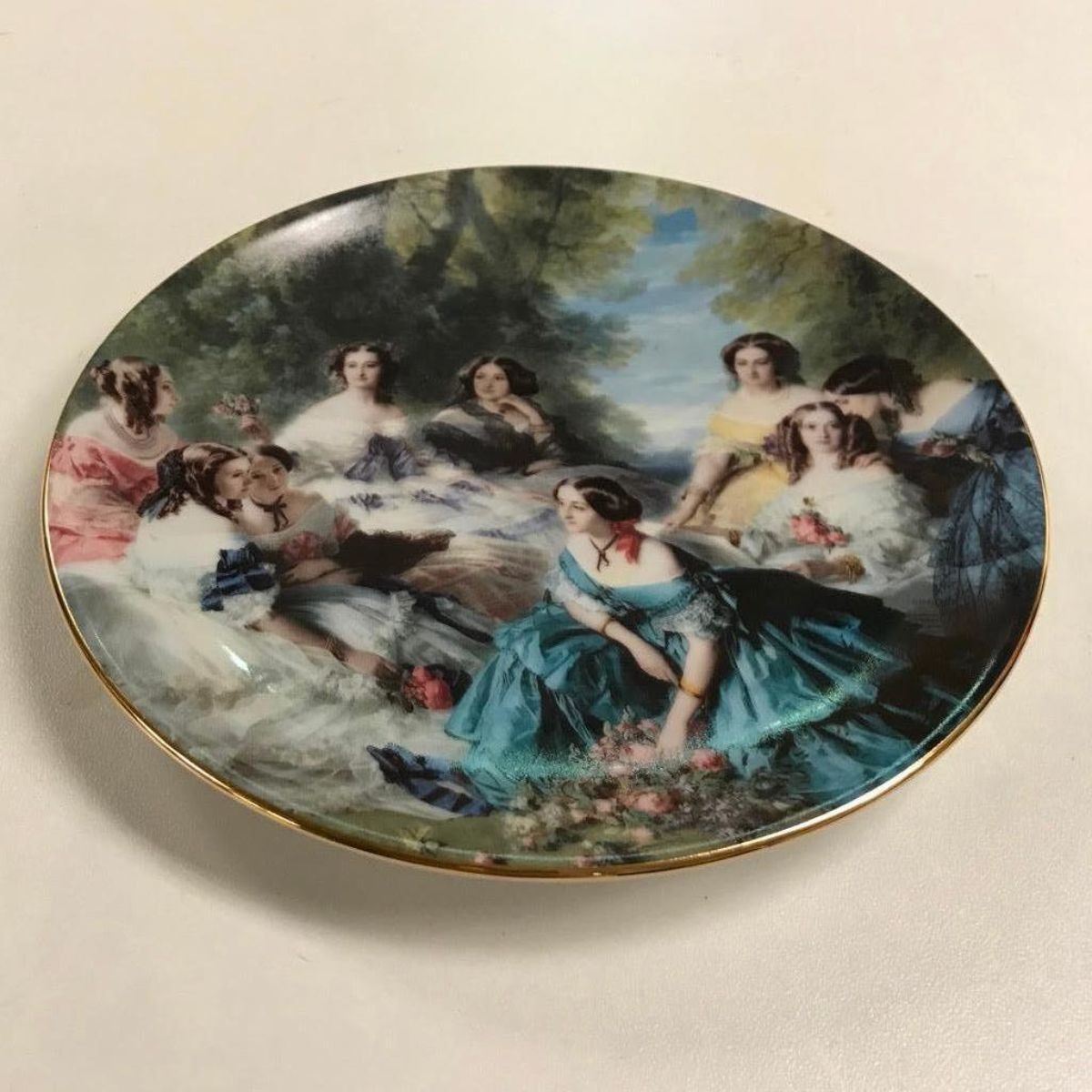 Limoges porcelain dessert or display, portrait plate with gilt edging. Scene of elegant 19th Century ladies posed within a landscape. Stamped on reverse "Porcelaine LG Limoges - Dec a la main". 7" D.