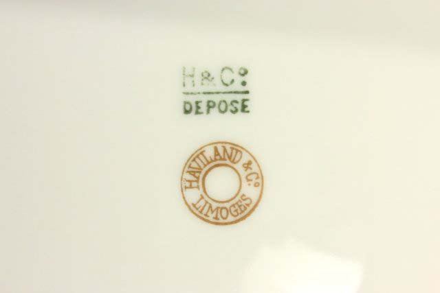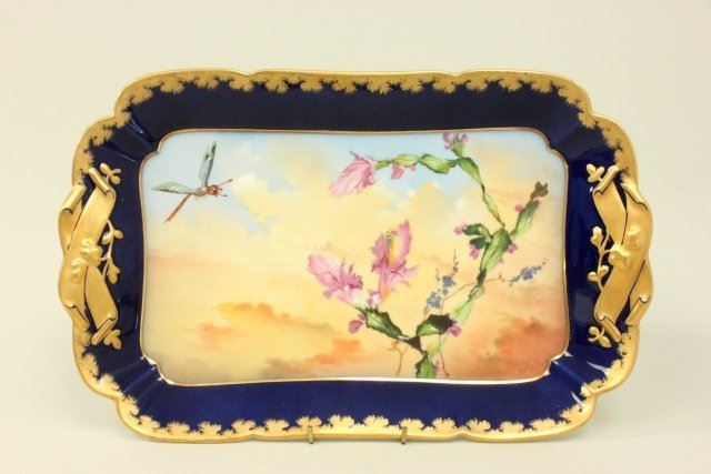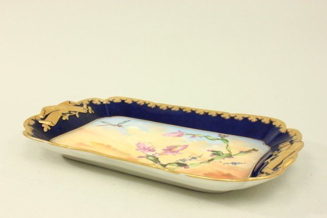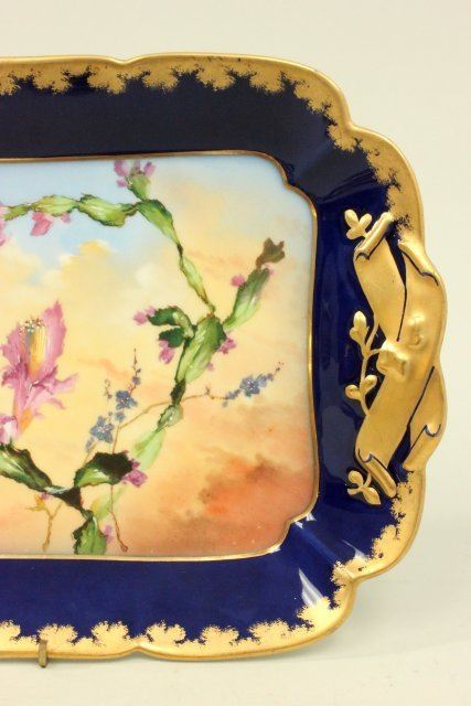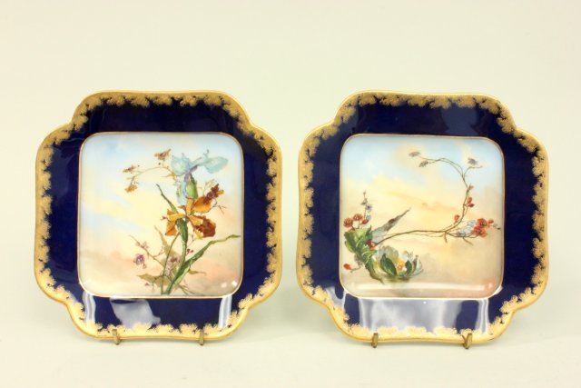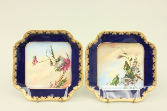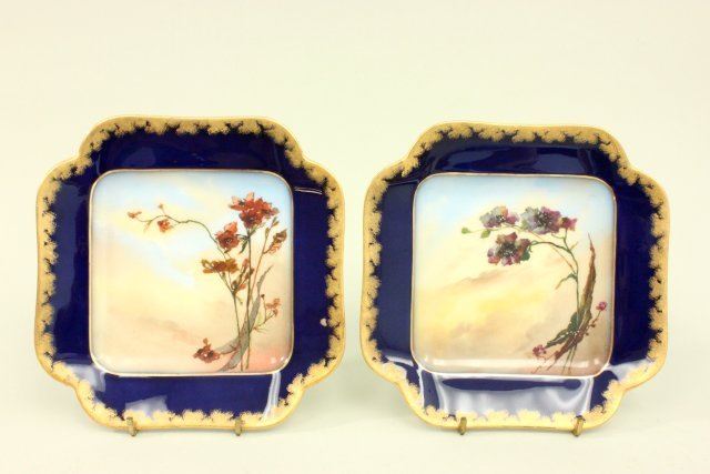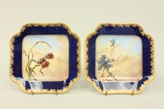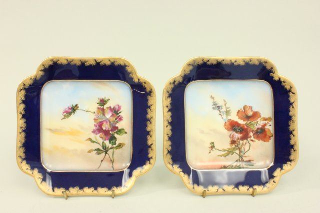 Set decorated with flowers, gilded edge, cobalt border. 11 pieces including 10 square plates approx. 7 1/8" W & oblong dish approx. 15 1/4" L x 9 1/2" W. (4126) Very good condition.
