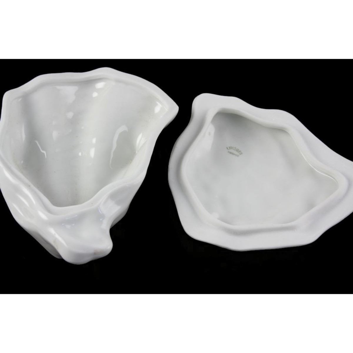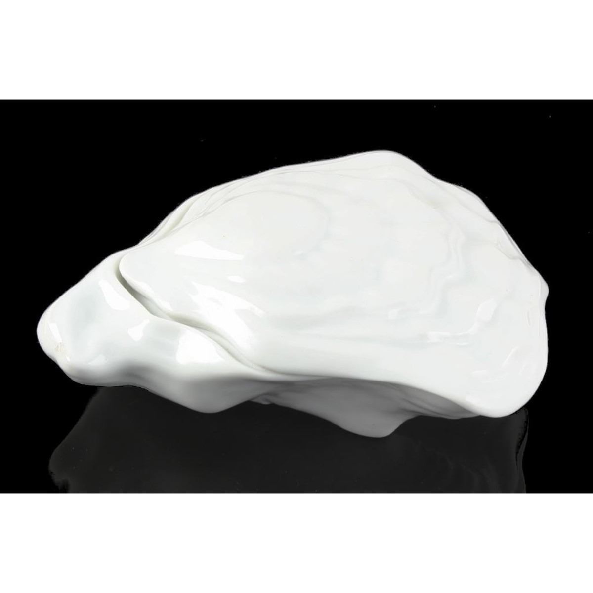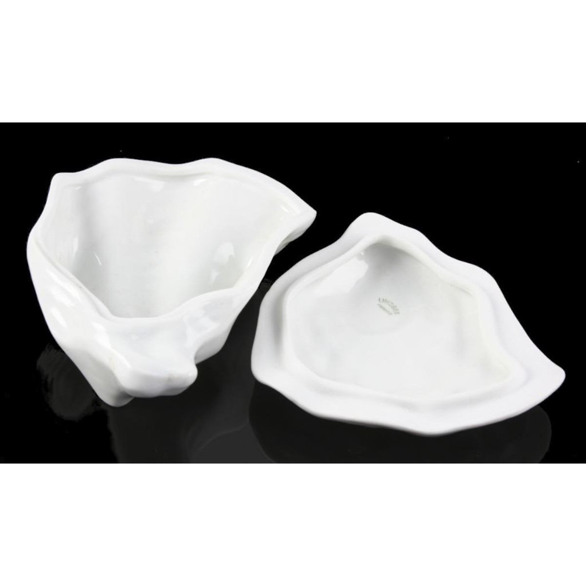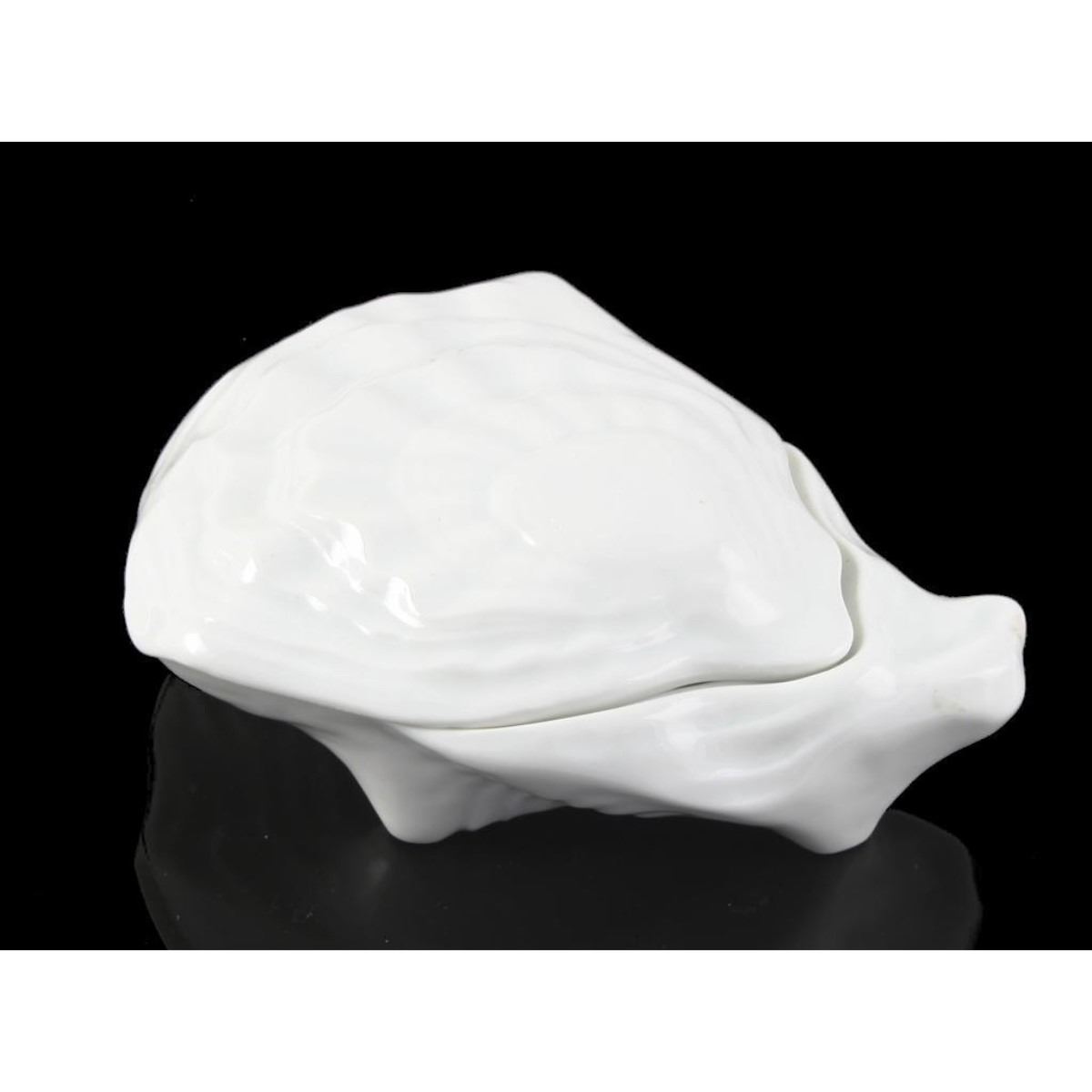 Porcelain vanity or trinket box in the form of an oyster shell. Hallmarked on the inside lid "Limoges France" Approx 6" L X 5" W X 2 1/4" H. Excellent condition.