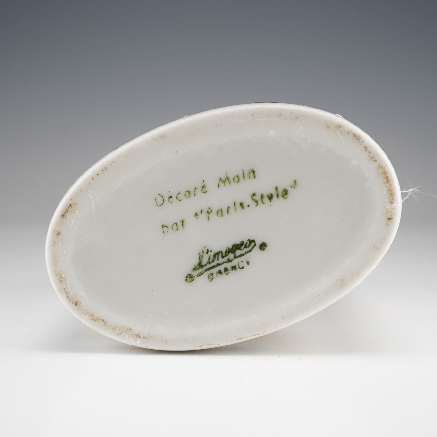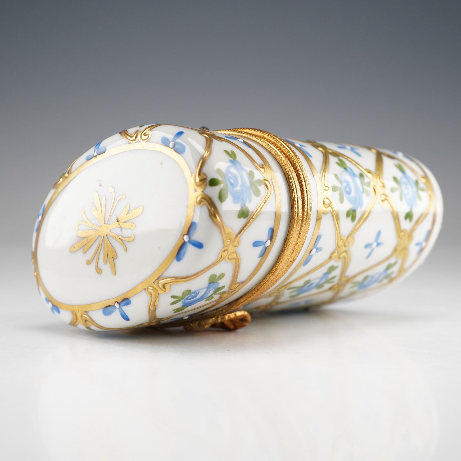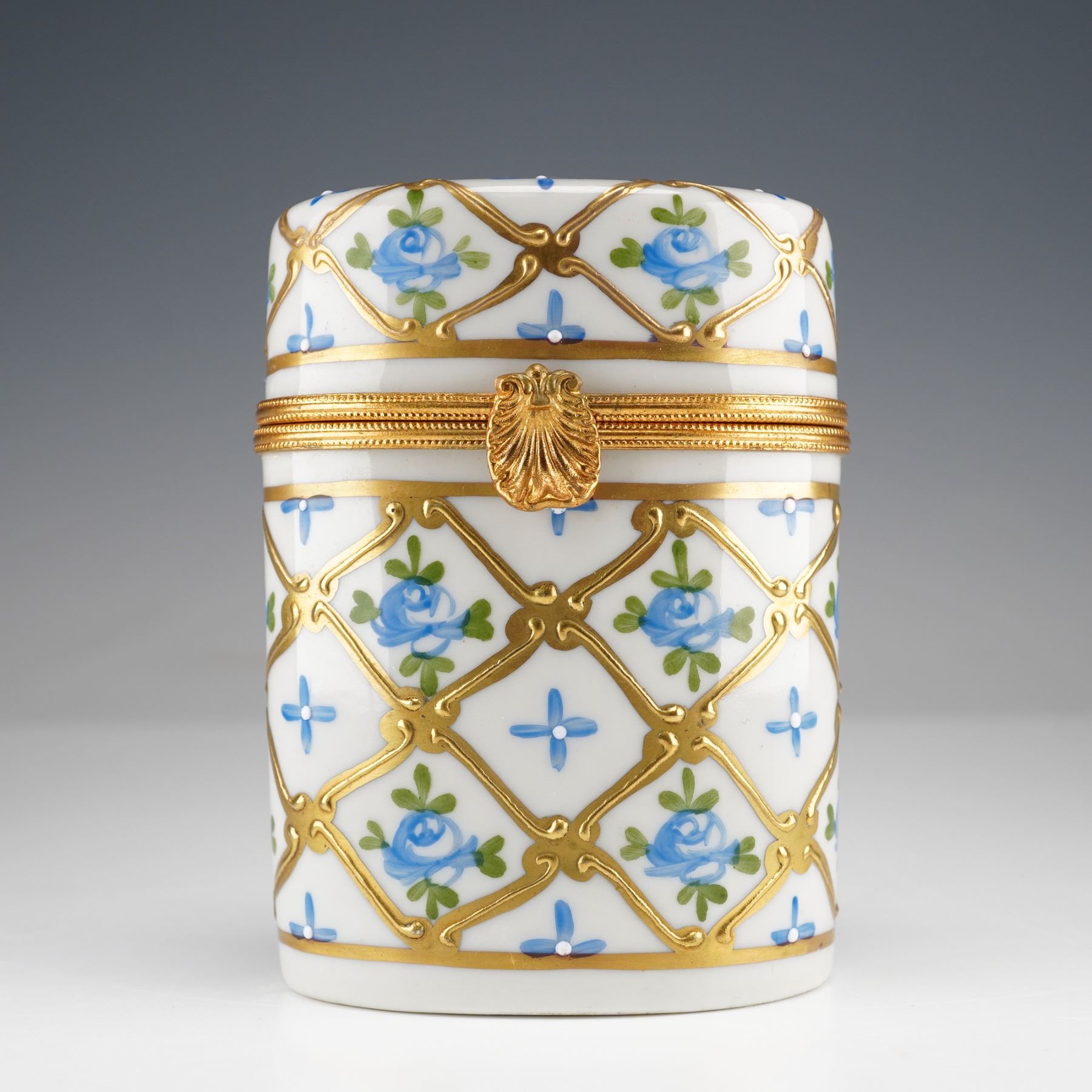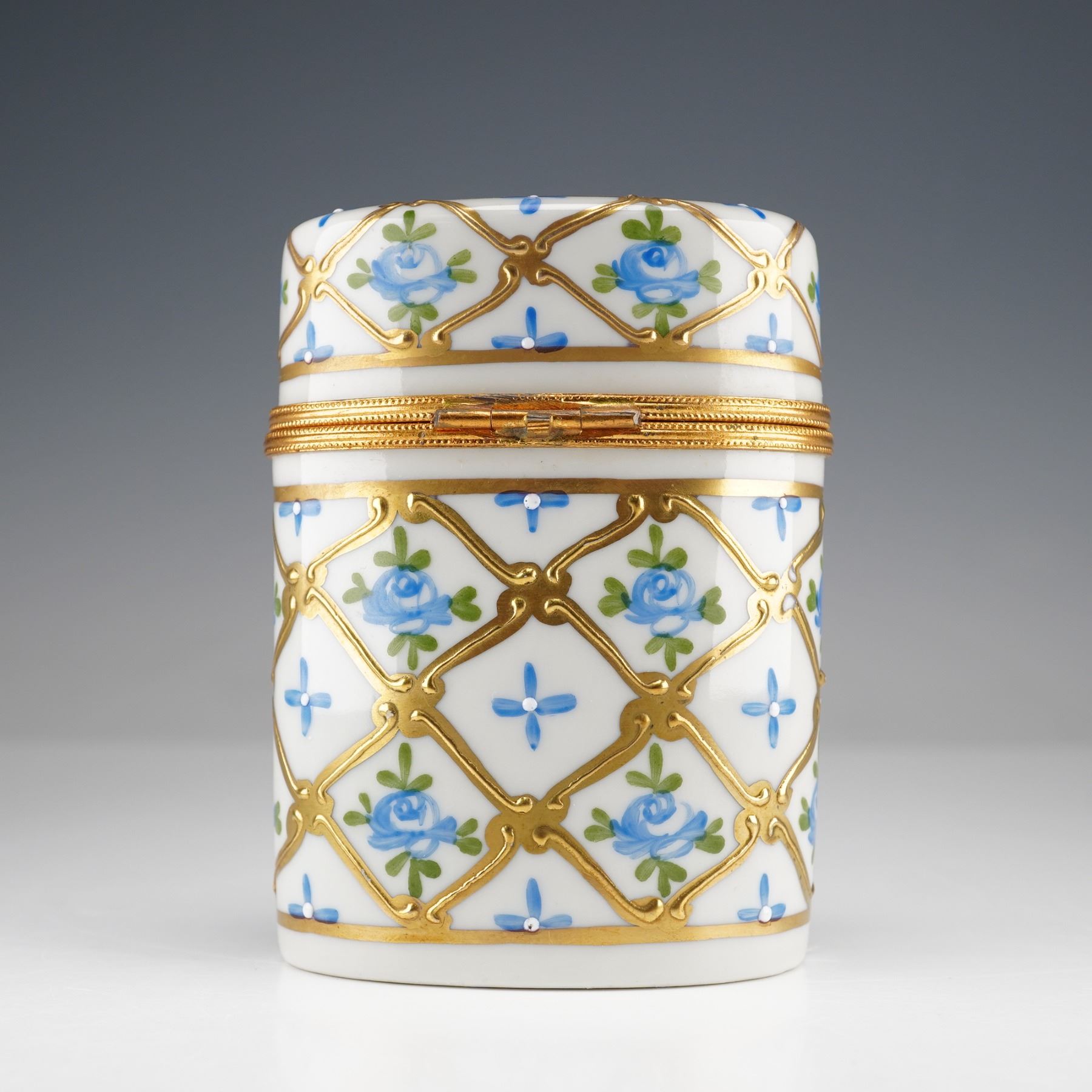 A hand painted porcelain box, decorated in the "Paris Style" tradition. The oval form container features a white ground adorned with a lattice pattern of gilt scrollwork enclosing small blue roses and stylized floral crosses. "Decore Main and pat "Paris - Style" written to the underside. Limoges France backstamp.