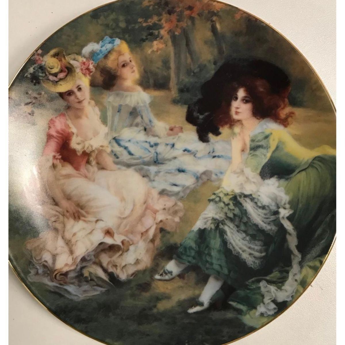 Limoges porcelain display, dessert portrait plate with gilt edging. Scene of elegant 18th Century rococo style ladies posed within a landscape. Stamped on reverse " Porcelaine LG Limoges - Dec a la main". 7"D. Â