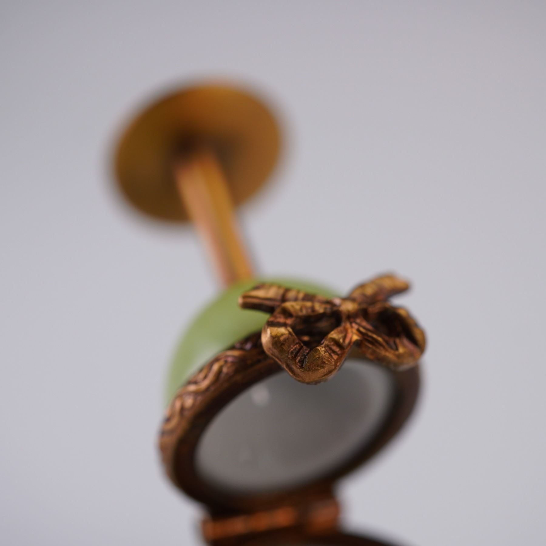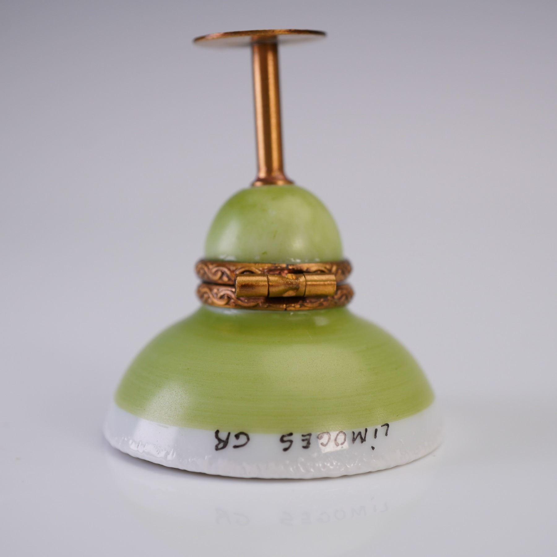 Crafted in the form of a miniature hat stand, this Limoges CR porcelain ring box features a domed green and white enamel base with a vertical brass stem and a round display-style top. The hinged lid opens at the midpoint, accented by a delicate metal bow clasp and an ornate floral band. Inside, the glossy interior provides a petite compartment for a ring or treasured keepsake. A playful and refined collectible that nods to vintage millinery. Measures approximately 2"H x 1.5"Dia.