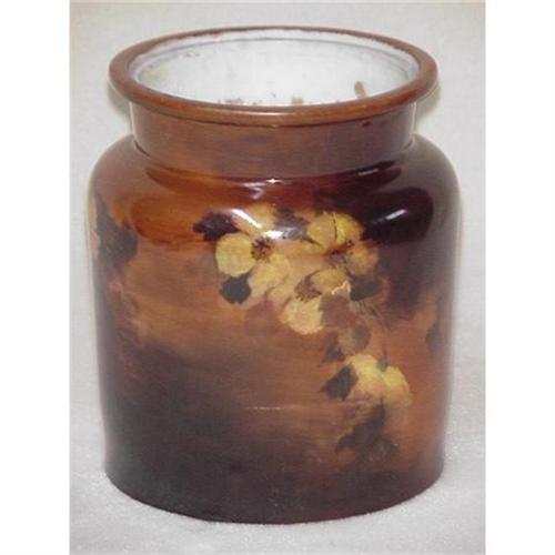 A hand painted Limoges porcelain pot, 6 1/2" tall, 5" indiameter, dark brown background with yellow flowers. Originally it had a lid but now missing, The condition is good no chips and the pot will hold flowers beautifully. (2)