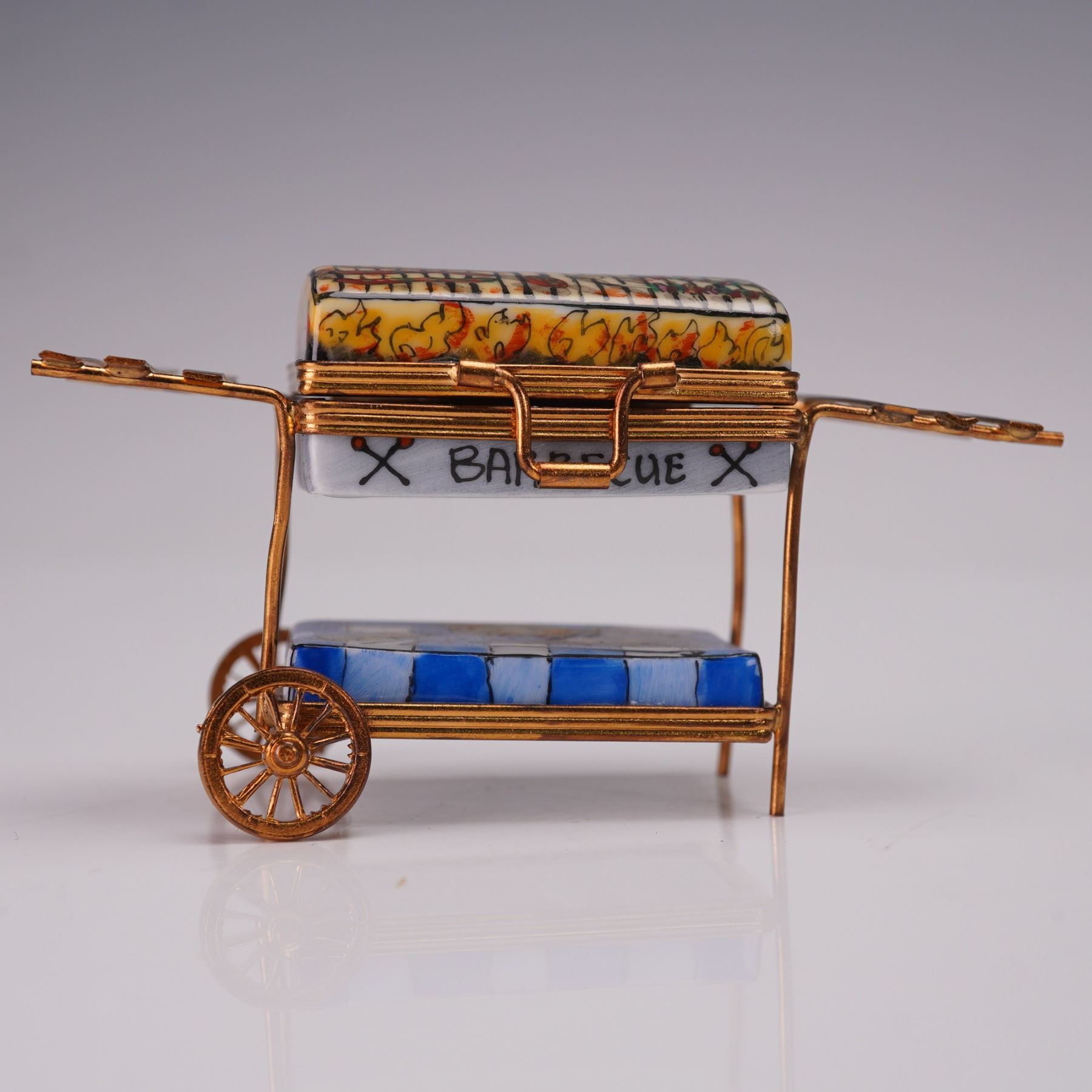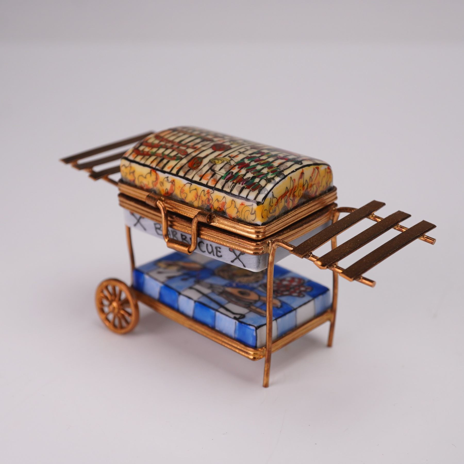 Hand painted Limoges porcelain trinket box in the form of a barbecue grill with gilt metal fittings, side racks, and rolling wheels. The lid shows a detailed grill with skewers and flames; inside the lid is a painted fire motif, and the base features a lively outdoor picnic scene. Marked Limoges France Peint Main RM to the underside.
