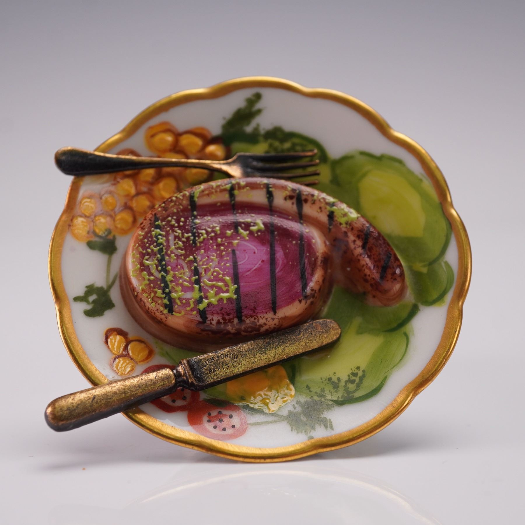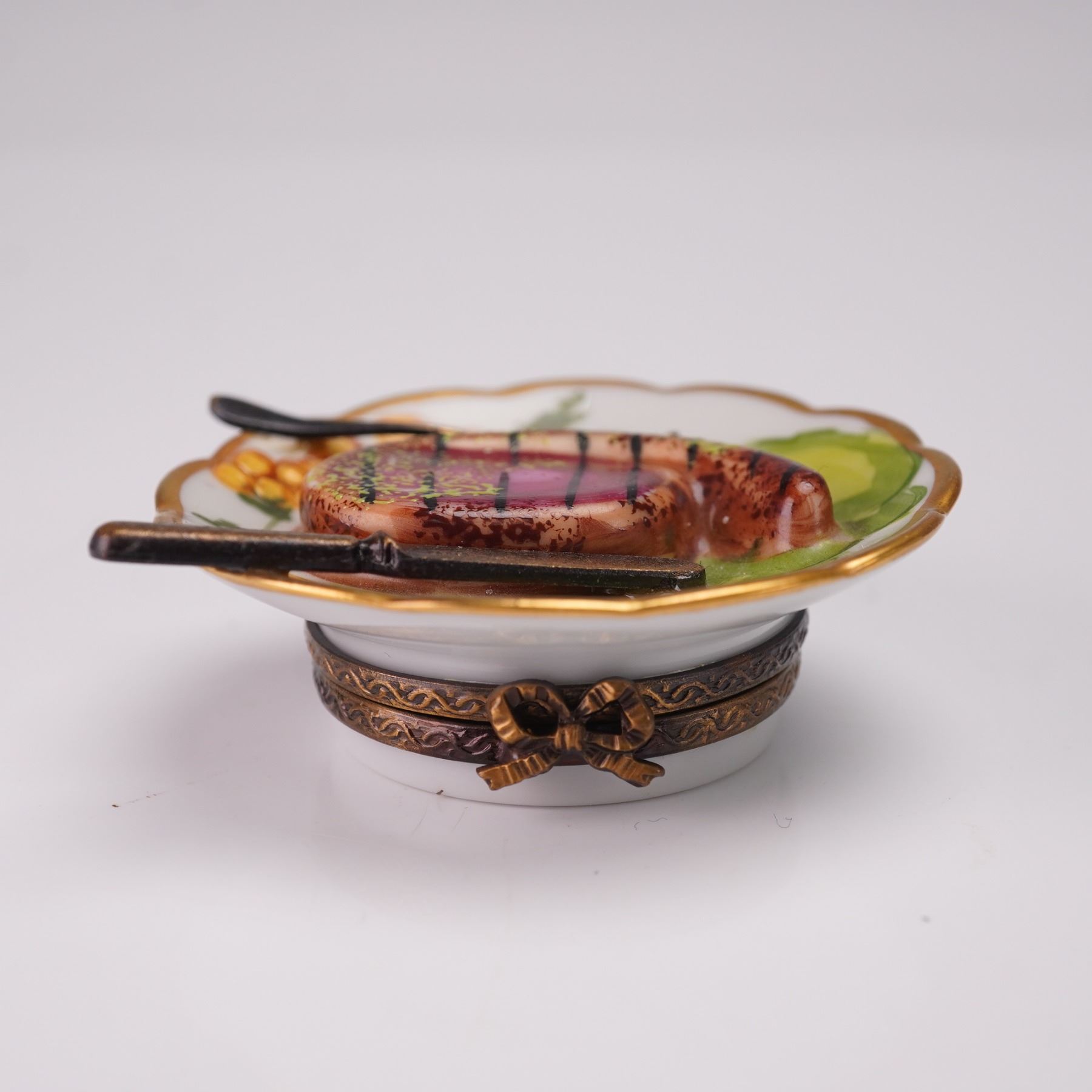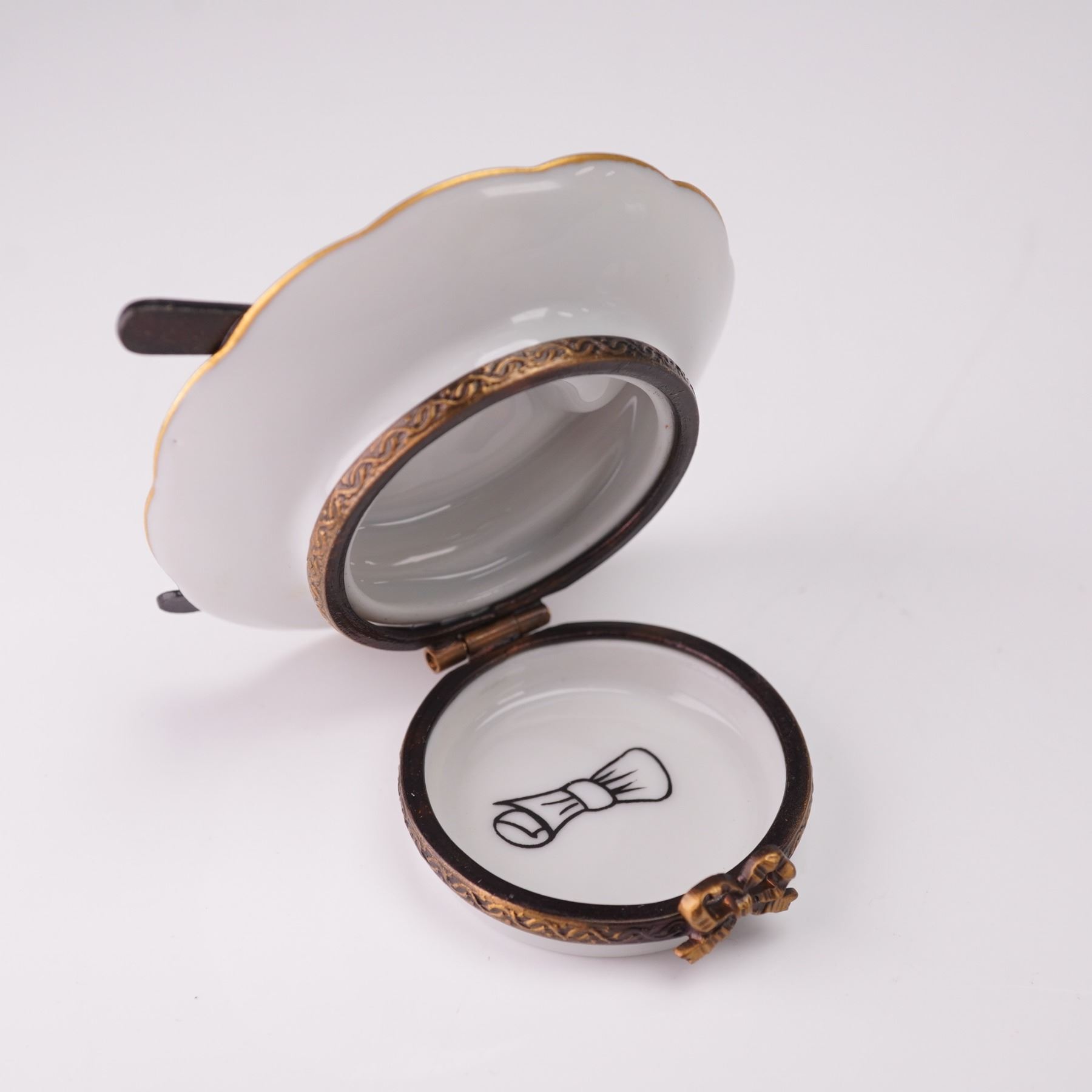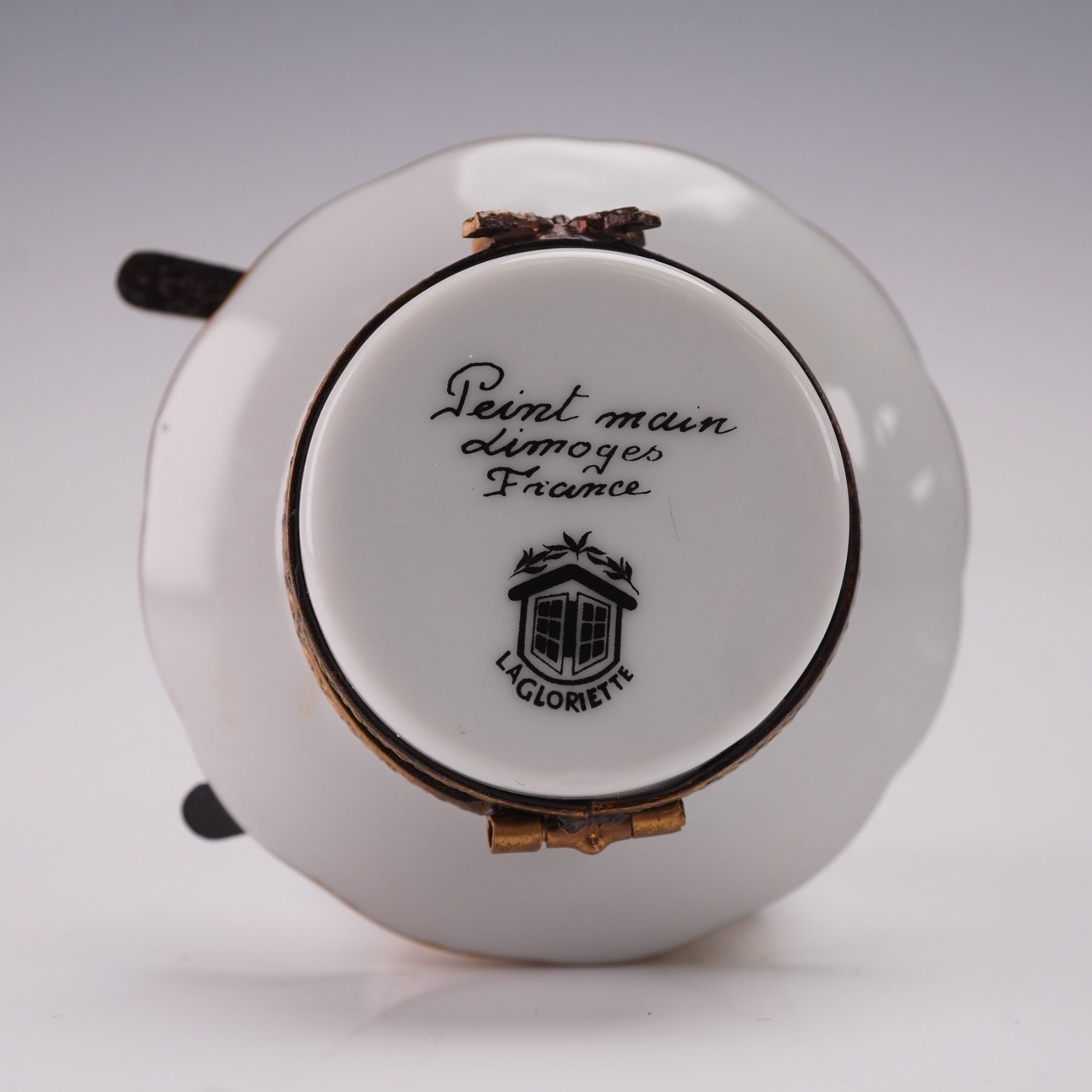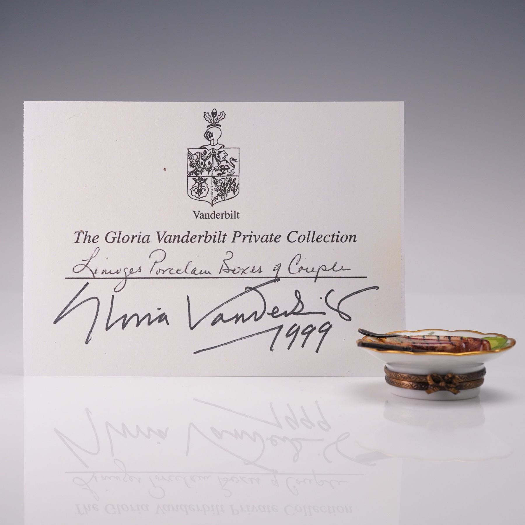 From the Gloria Vanderbilt Private Collection is a Oval hand-painted Limoges porcelain box depicting Madame Zborowska With an accompanying certificate signed Gloria Vanderbilt 1999. Hinged brass mount with floral clasp. Interior lid features a line drawing portrait of Modigliani with signature. Marked on the base is Limoges France with artists mark.