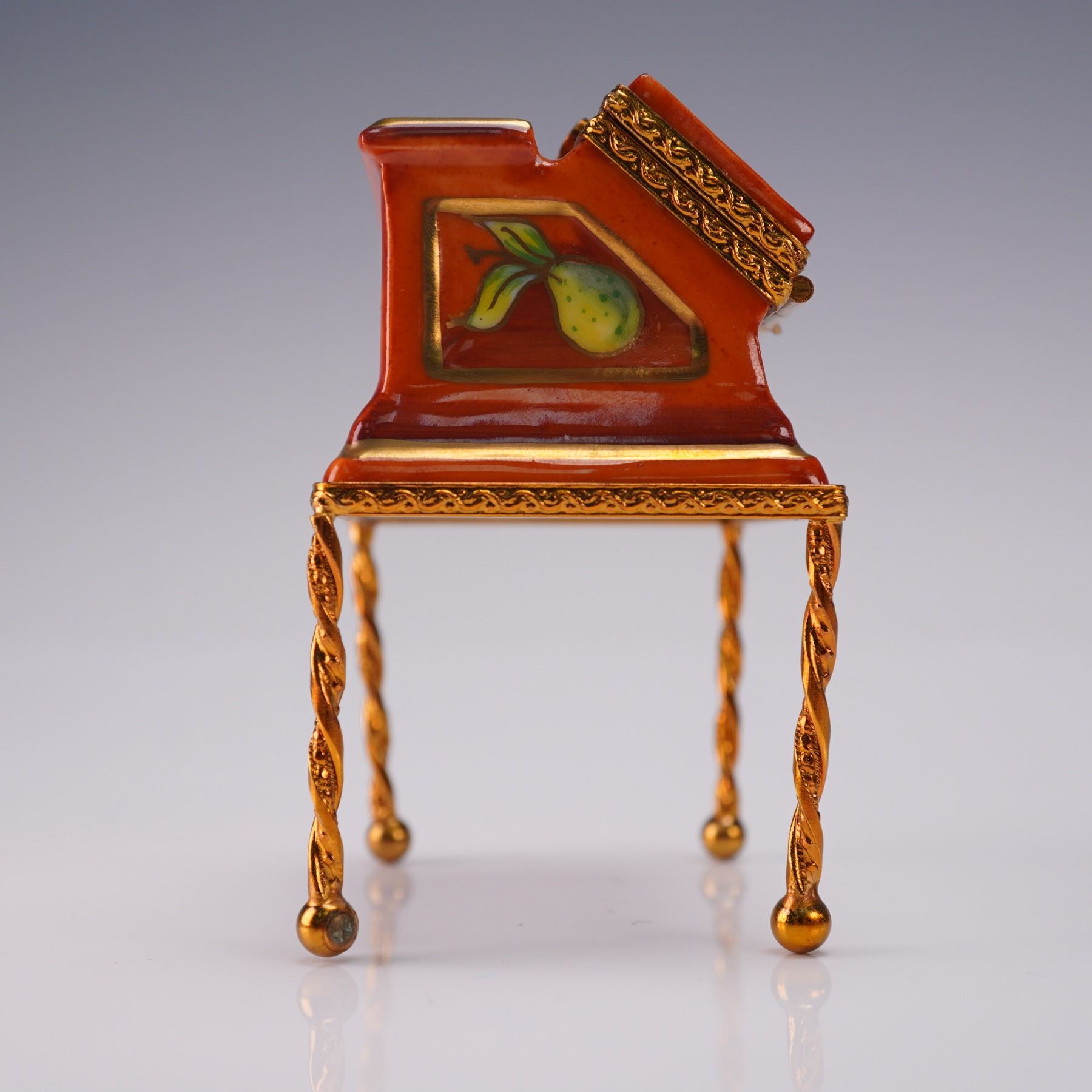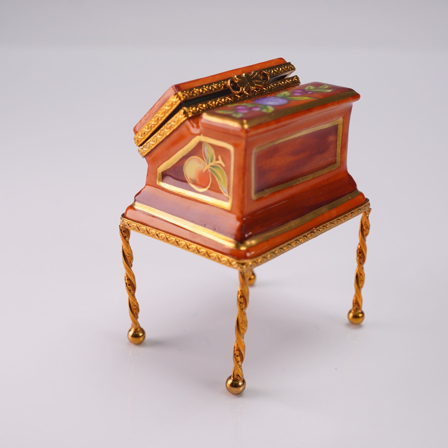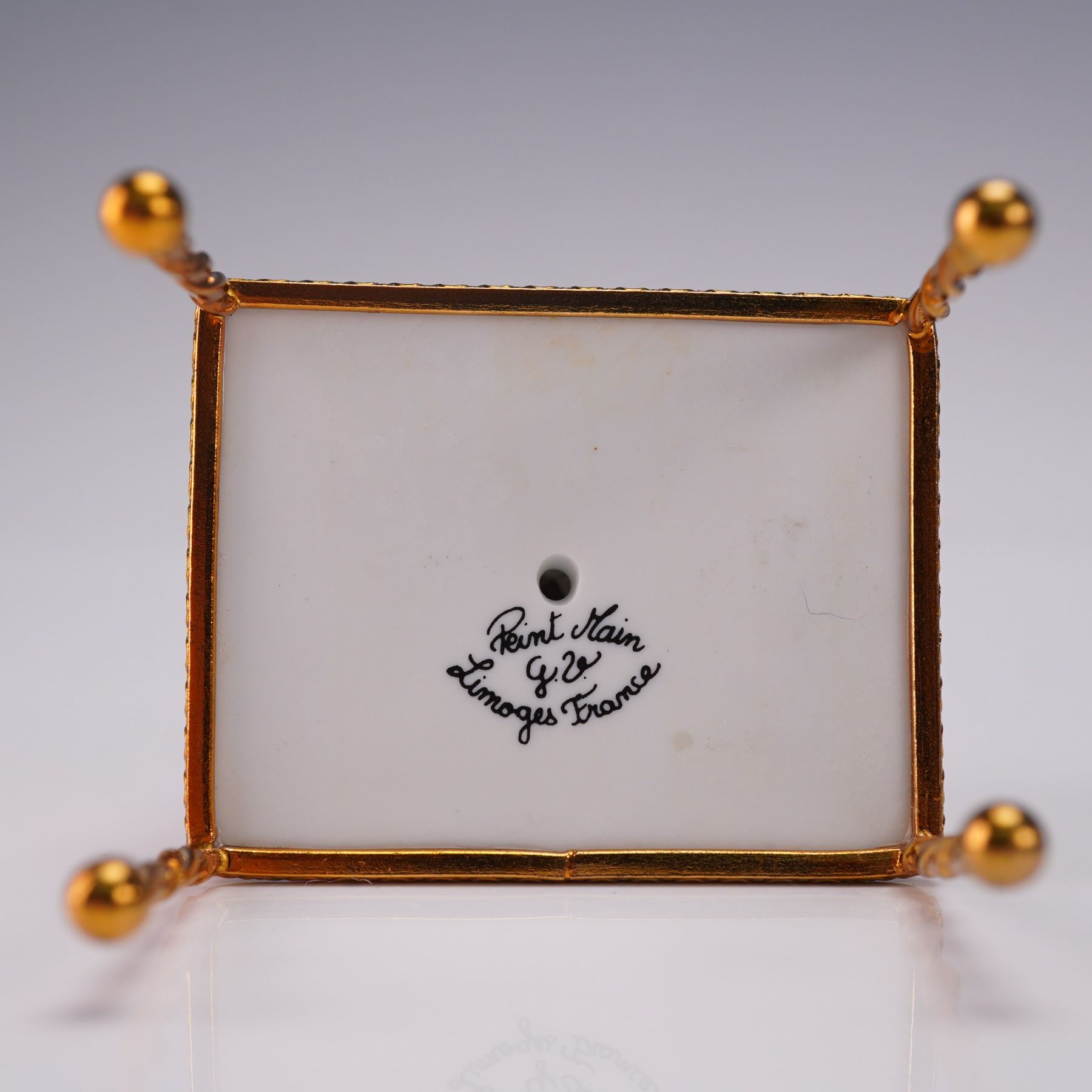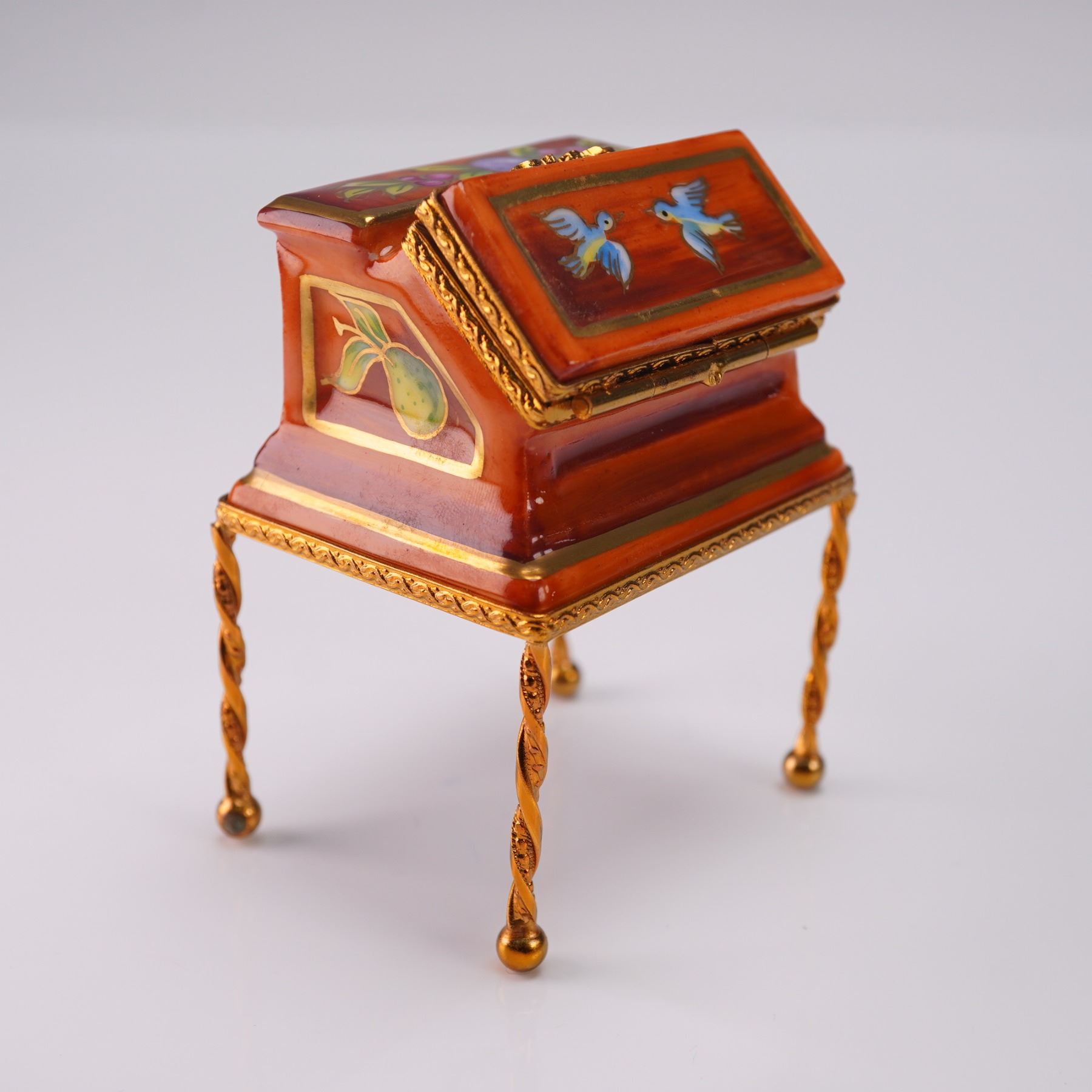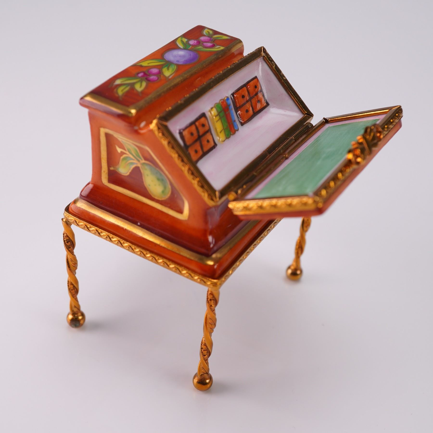 A charming hand painted porcelain trinket box from Limoges, France, modeled as a slant-top writing desk on four ornate gilt metal legs. The surface is richly decorated with fruit, foliage, and a pair of bluebirds on the lift-up writing lid. The interior is fitted with painted books and drawers, evoking the desk's contents, and the piece is signed on the underside, Peint Main G.V. Limoges France. Finely detailed in vivid enamel tones with gilt metal mountings and a bow clasp.