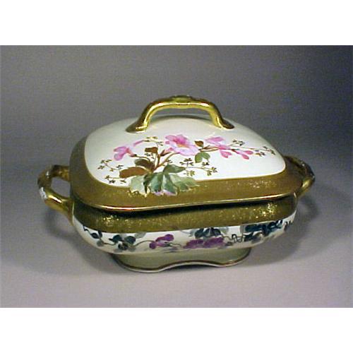Here is a sensational Limoges covered serving dish that is masterful in design. The colors are vivid and naturalistic. The detail is exceptional! It has purple and pink enameled flowers embracing the edges in a fabulous free flowing form. The outer rim of the lid and dish are gold gilded with an interior rim that is in a pale pea green with specks of gold enameling throughout. The serving dish is in very good condition ? though there is some minute wear to the gold gilding on the outer rim and a good amount of wear to the gold gilding on both handles due to use and age. It measures 5 ¾?h (including handles) x 10 ¼?w (including handles) x 7 ½? deep. There is an impressed mark on the bottom of an intertwined RM in fancy script ? you can find this same mark in the book Distinctive Limoges Porcelain by Keith & Thomas Waterbrook-Clyde on page 237 for Martial Redon (1882-1896.) There is an underglaze mark on the bottom of an M & R in green. You can find this same mark in the book Collector?s Encyclopedia of Limoges Porcelain by Mark Frank Gaston on page 269 for Martial Redon (1882-1890). In fancy script it is also marked in red RB. It is also impressed with what looks like an O in fancy script and the word depose.