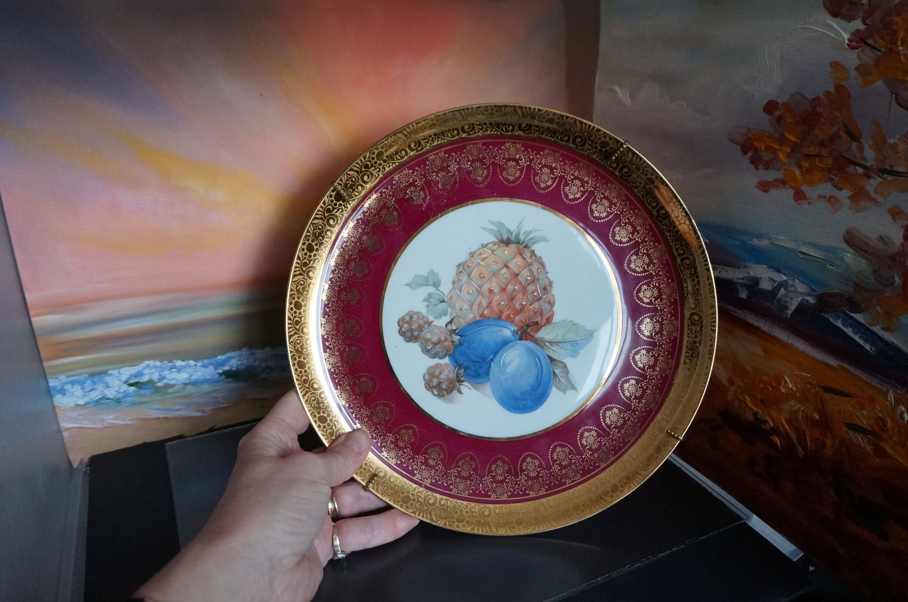 Limoges Rehausse Main Painted Plate, Still life with pineapple and plumps,Cabinet Plate Limoges Plate,Gold red Trim,Limoges Decorative Plate
