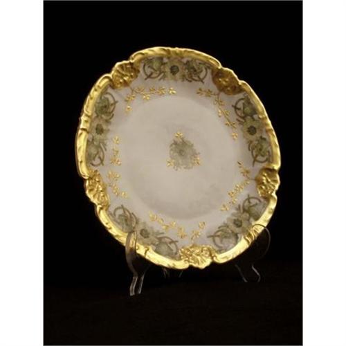 Extraordinary heavily gilded Limoges cabinet plate with scalloped border decorated with hand-painted flowers in shades of green and gold leaves in relief. It is marked on the underside with a green Limoges France mark. The country of origin mark was required by US law on goods imported after 1891. In very good condition as shown. Acrylic stand is for display purposes only and not included.