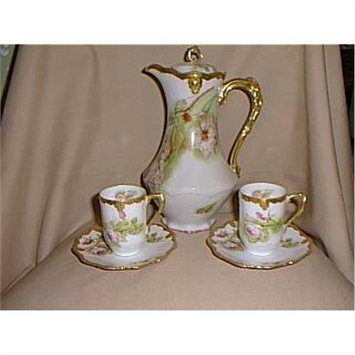 Beautiful chocolate pot with 2 tall chocolate cups and saucers made in Limoges, France. It carries the Coronet backmark which shows it was distributed by George Borgfeldt and decorated by Coiffe Limoges, circa 1900-20. White porcelain with large handpainted roses, heavy gold trim. Pot measures 10.25" high to finial and 5.5" wide at largest area. Cups measure 3" high by 2 3/8" wide and saucers are 5". No chips or cracks or worn gold. A wonderful set for display or use.