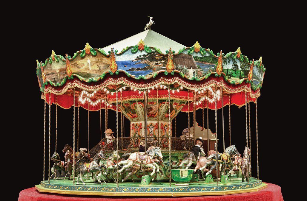 Limonaire Karussell. Fantastisches Französisches Pferdekarussell. Mit Pferden, Kutschen und Orgel. Elektromechanischer Antrieb mit Kassettengerät, Orgelmusik und wunderschöner Beleuchtung. Nur sehr wenige gebaut. Museumsqualität. Ø124 x 195cm mit Sockel. Eduard Léguery, France, circa 1980.