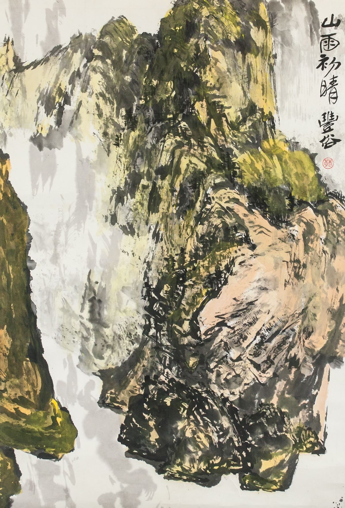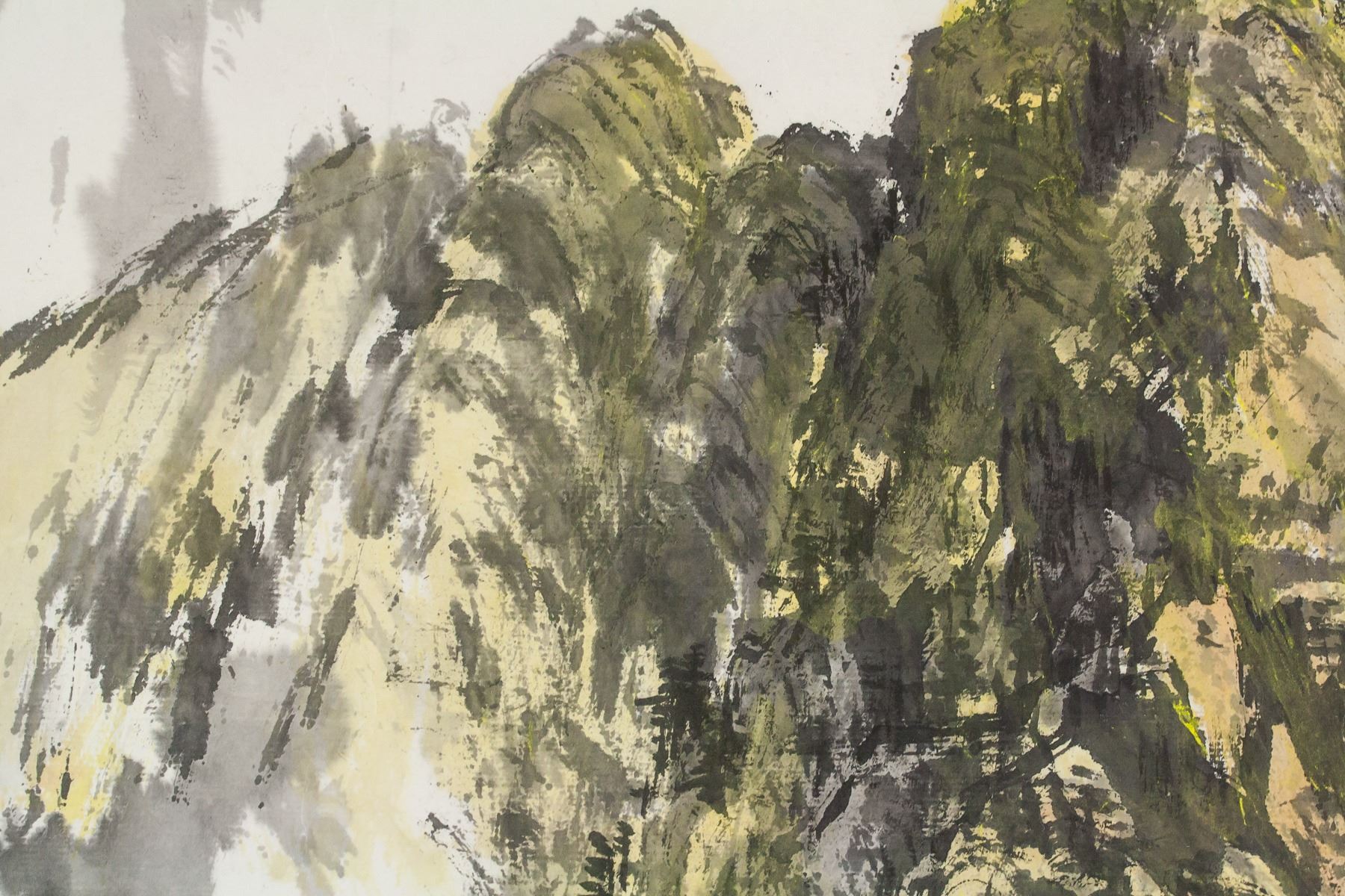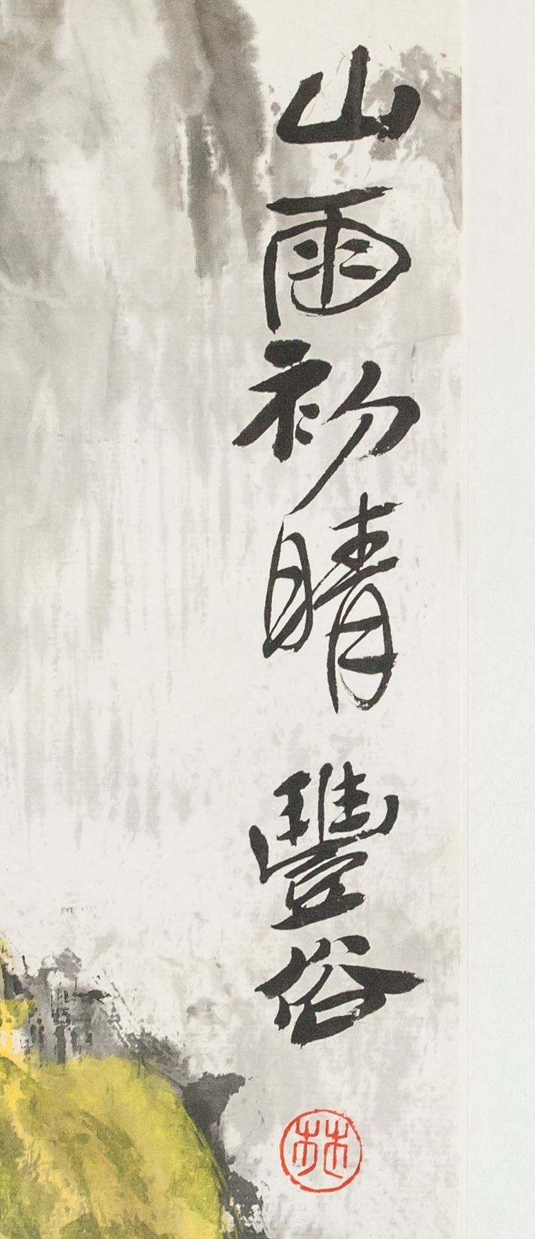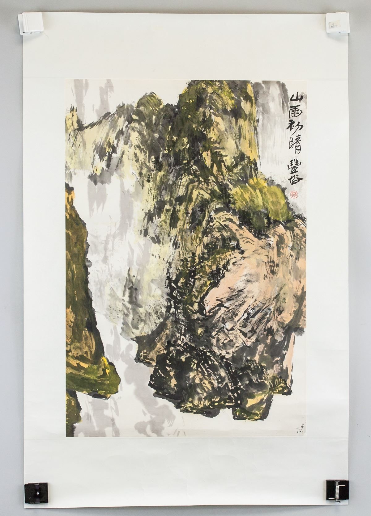 Chinese ink and watercolor on paper roll. Featuring a mountainous landscape scene. Signed Lin Fengsu (1939-2017, Chinese), inscribed with one artist seal. 64 x 43 cm