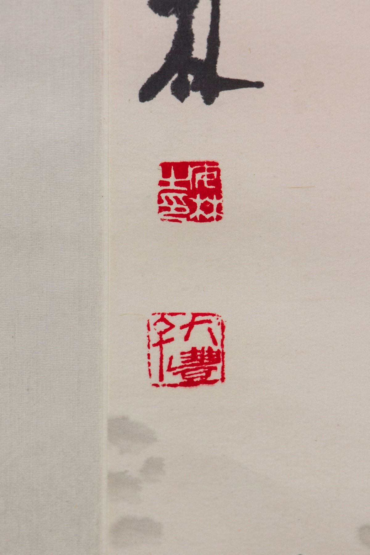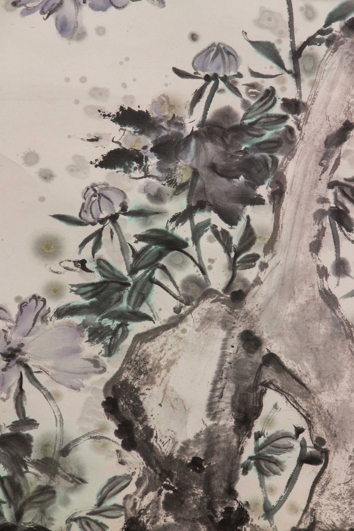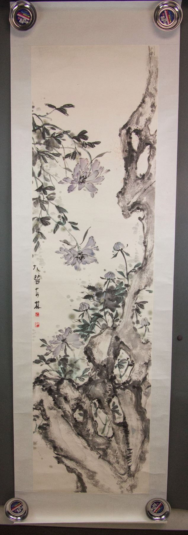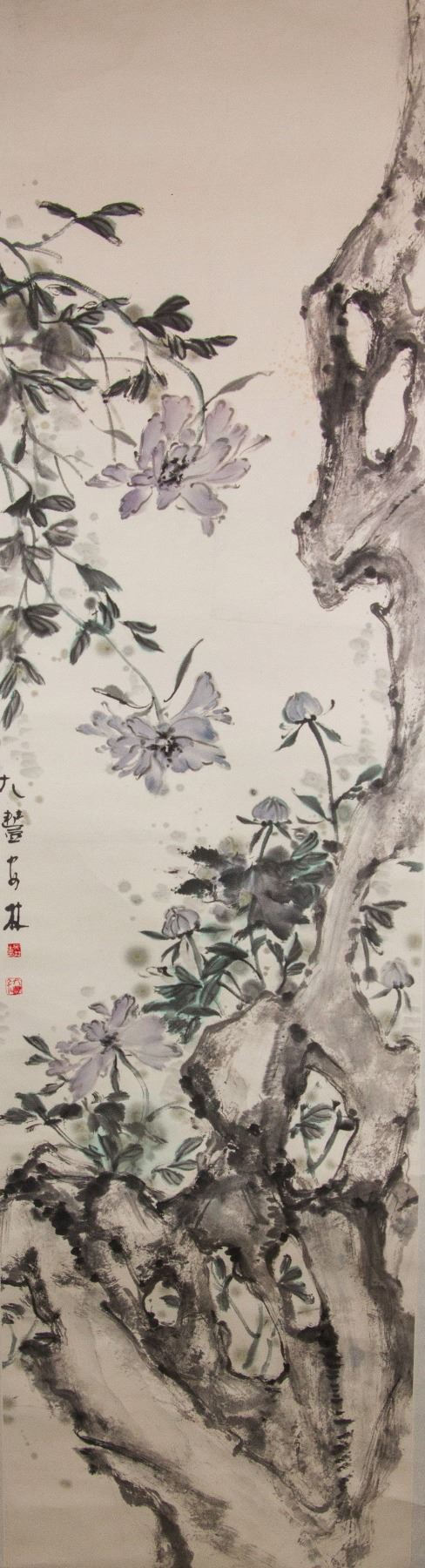Painting of flowers and craggy rock; Chinese ink and watercolour on paper roll; signed Lin Fengsu (b.1939); inscribed with 2 artist seals; 180 cm x 48 cm