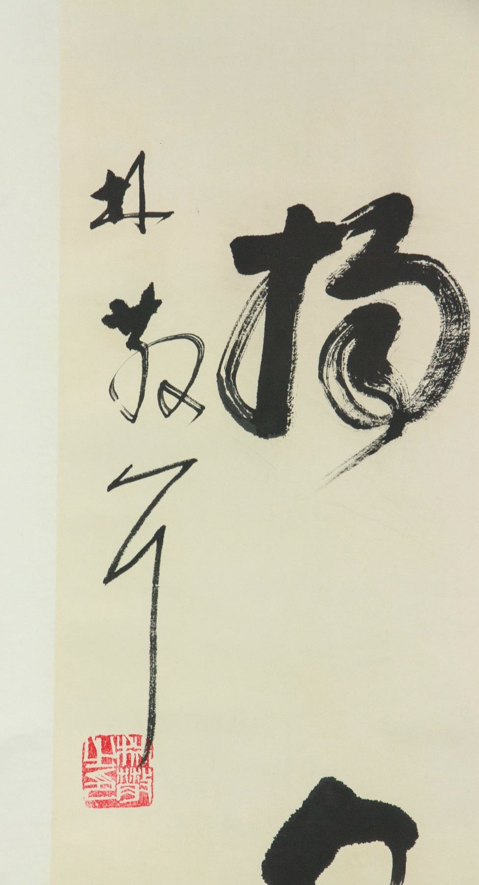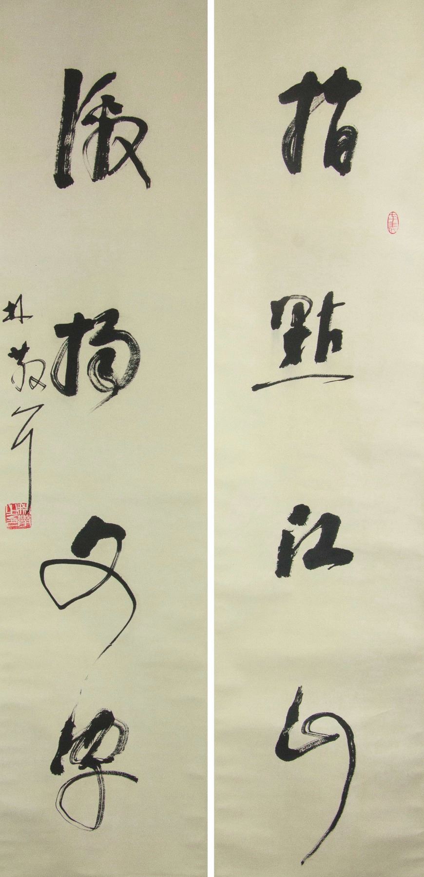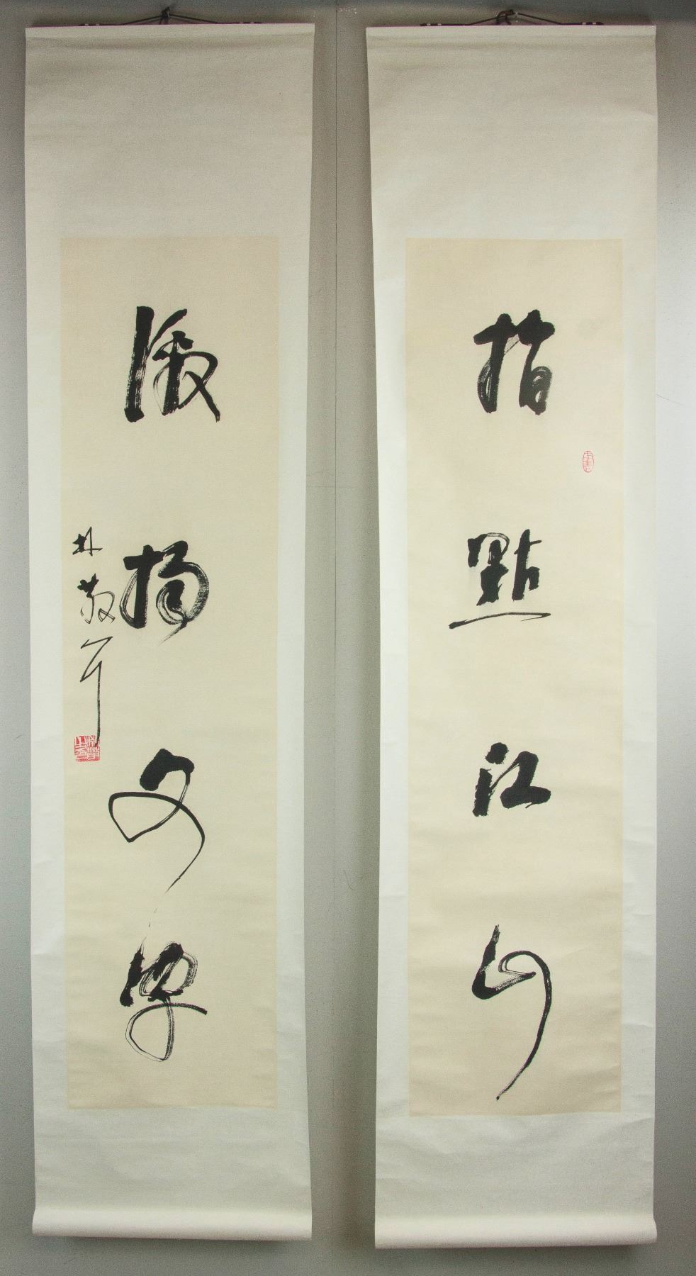 Pair of Chinese character calligraphy in cursive script; Chinese ink on paper; hanging scroll; signed Lin Sanzhi (1898-1989); inscribed with 2 artist seals; 135 cm × 33 cm