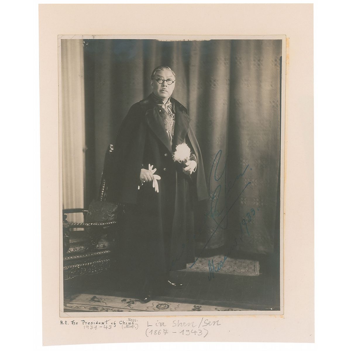 Chairman of the National Government of the Republic of China (1868–1943) who had a prominent role in combating the Japanese invasion of Taiwan. Remarkable vintage matte-finish 5.75 x 7 full-length photo of Sen, signed in black fountain pen and dated, “Moscow, 1933.” Affixed to a slightly larger sheet. In fine condition, with minor creasing to corners, some light silvering, and a small area of wrinkling to top edge from adhesive on reverse, and light contrast to signature due to dark background.