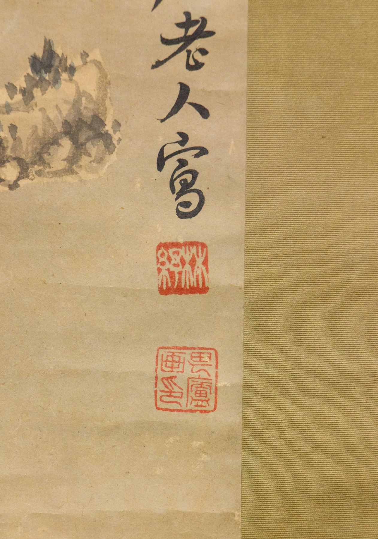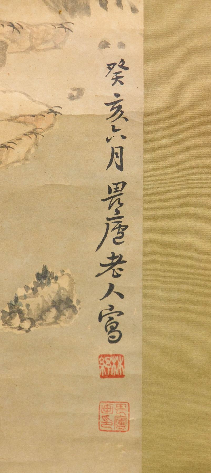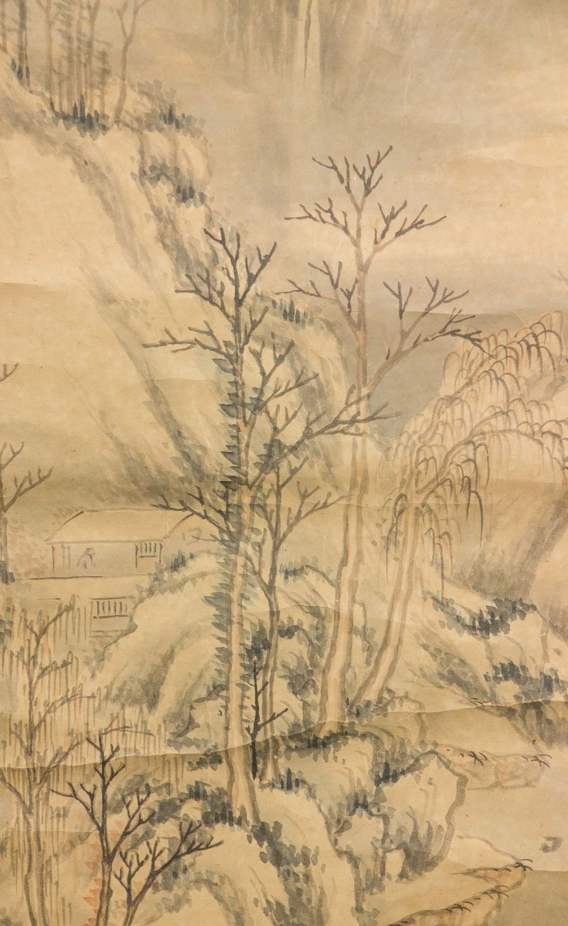 Mountainous landscape with cabin; Chinese ink and watercolour on paper roll; signed Lin Shu (1852-1924); inscribed with 2 artist seals; 101.5 cm x 30.5 cm