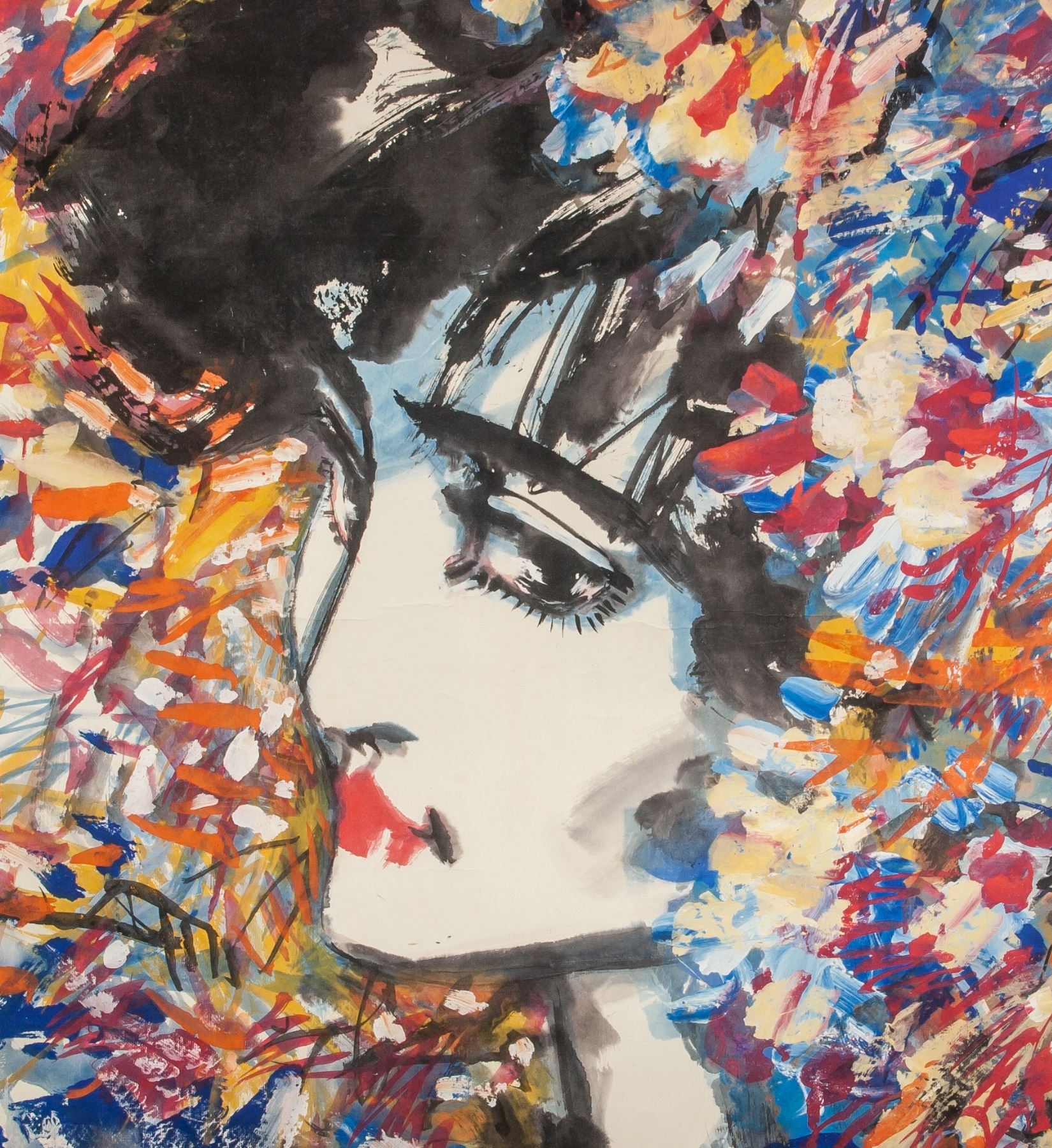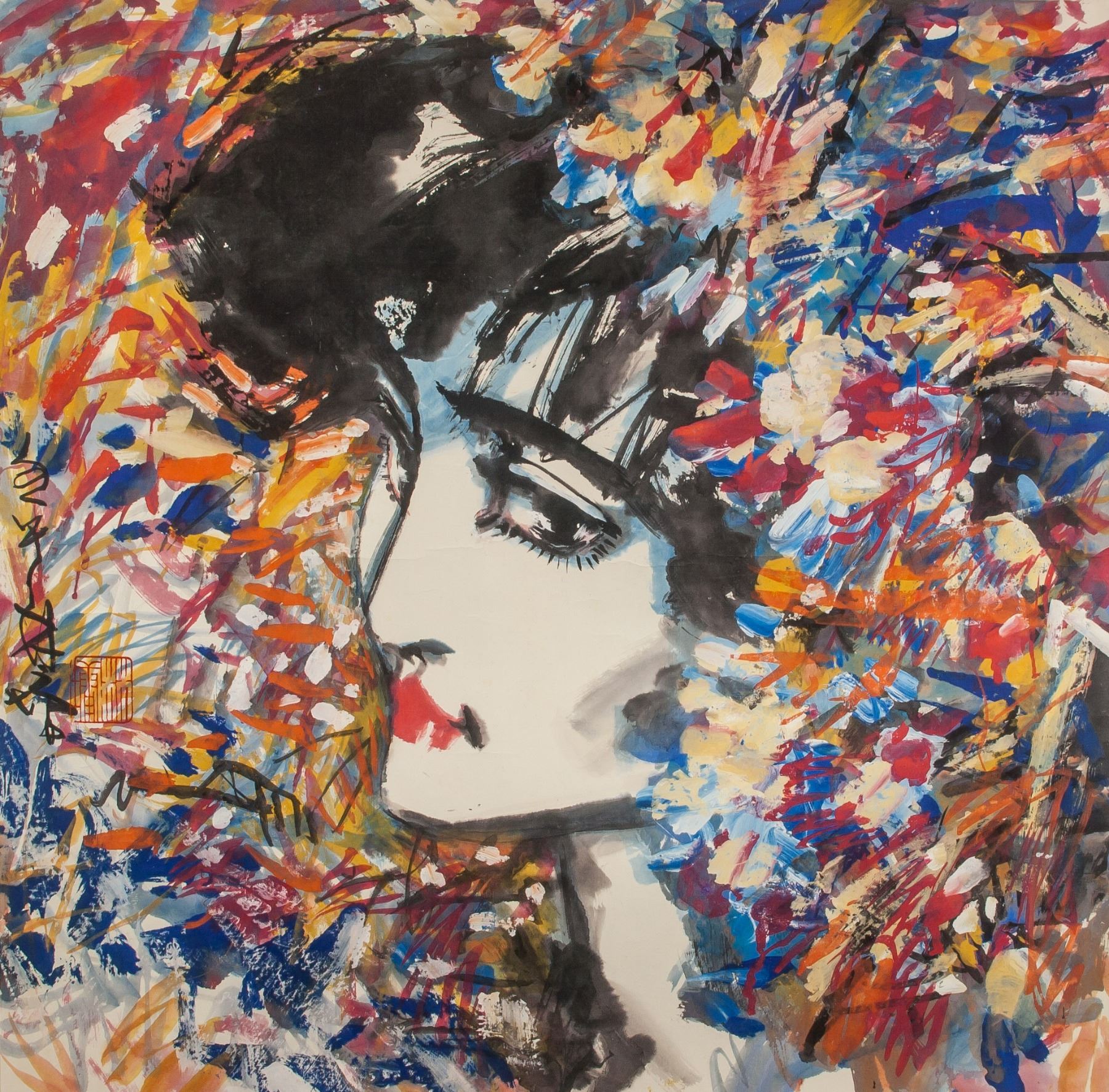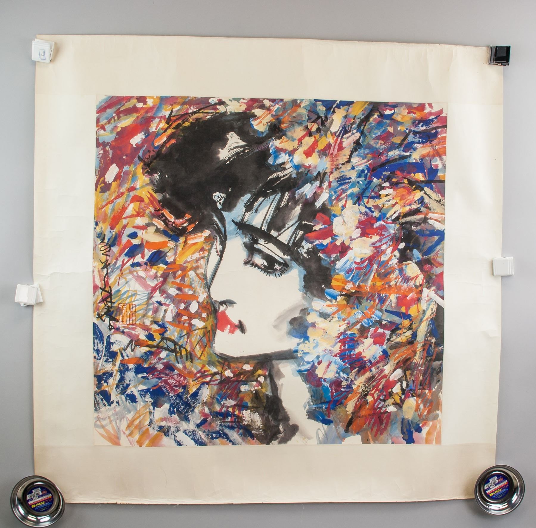 Woman portrait, Chinese ink and watercolor on paper roll, signed Lin Yong (b.1942), inscribed with 1 artist seal, 68 x 68 cm