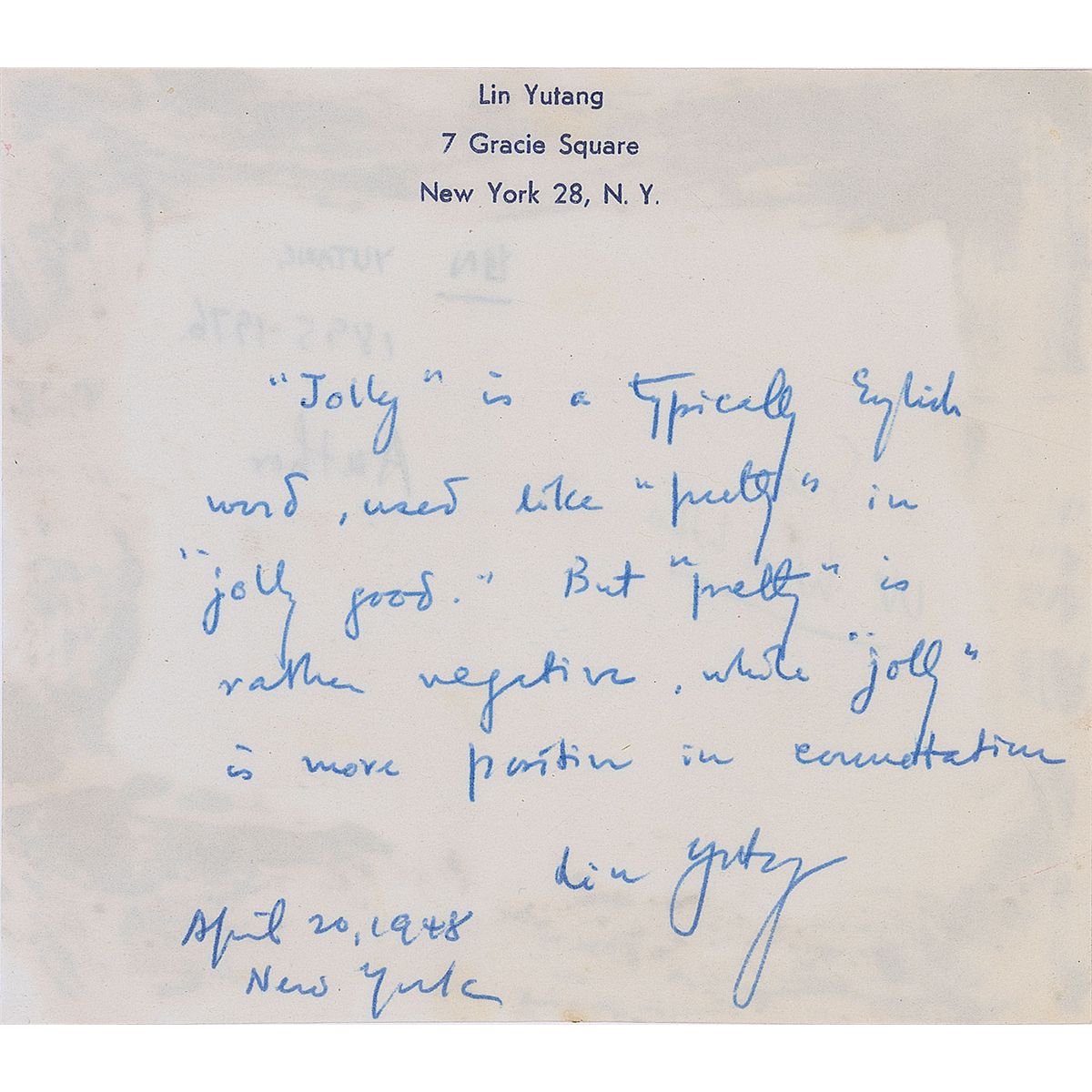 Writer (1895–1976) whose compilations and translations of classic Chinese texts into English were bestsellers in the West. ALS, one page, 4.75 x 4.25, personal letterhead, April 20, 1948. In full: “‘Jolly’ is a typically English words, used like ‘pretty’ in ‘jolly good.’ But ‘pretty’ is rather negative, while ‘jolly’ is more positive in connotation.” In fine condition, with trimmed edges and subtle show-through from adhesive remnants to reverse.