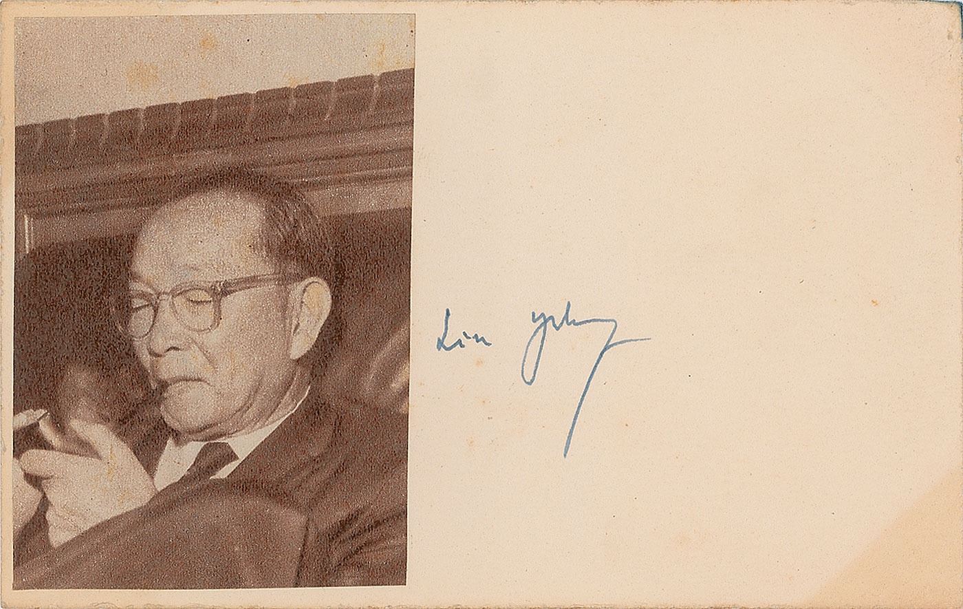 Vintage ink signature, "Lin Yutang,” on an off-white 5.5 x 3.5 card bearing an affixed image of the Chinese scribe. In fine condition, with toning to the lower right corner.