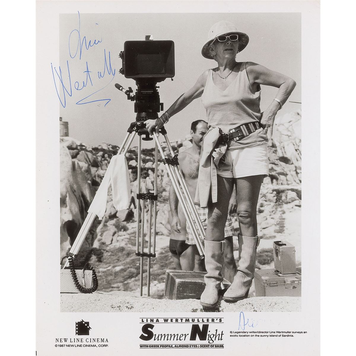 Italian screenwriter and film director (born 1928) best known for her films The Seduction of Mimi, Swept Away, and Seven Beauties, the latter of which established her as the first woman to be nominated for an Academy Award for directing. Scarce glossy 8 x 10 New Line Cinema publicity photo of Wertmuller on the set of her 1986 film Summer Night, signed in the upper left in blue ballpoint, with an unfinished notation by Wertmuller in the lower right corner. Light bends to corners, creasing to upper right corner tip, and trivial skipping to a single letter of the signature, otherwise fine condition.