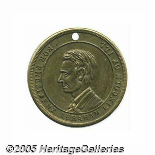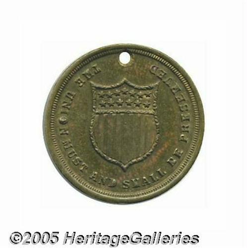 <B>Lincoln 1860 Campaign Token with Shield on Back</B></I> An example Sullivan 1860-64, 22 mm, brass, holed for suspension as typically found, the patriotic shield and ubiquitous slogan, "The Union Must and Shall be Preserved," adorn the back. Another classic campaign medal from arguably one of the two most important campaigns (the other being four years later!) in American history. Lot:257