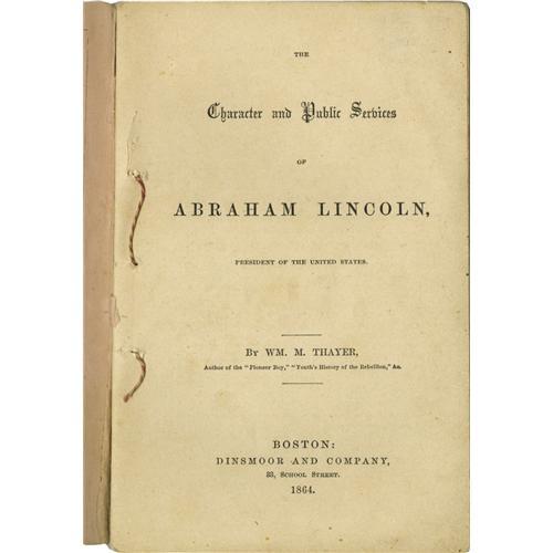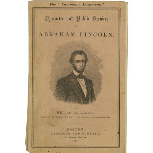 <B>Lincoln Campaign Booklet,</B></I> <I>Character and Public Services of Abraham Lincoln</B></I> by William M. Thayer, 76 pp., 4.25" x 6.75", paper wraps (Boston: Dinsmoor and Company, 1864). This small volume absolutely gushes in praise of the incumbent, leaving the reader panting for a second term. The author describes Lincoln's efforts on behalf of the Union and includes a transcript of the Gettysburg Address. The outer wrap has 2" split along the spine, else this is a clean, tightly bound copy. An exceptional copy of a book that is usually seen with torn corners, edge roughness, and cover soiling.<BR><BR><b>Shipping:</b> Small Flat (<a target="_blank" href="http://www.heritageauctions.com/common/shipping.php">view shipping information</a>) <BR><BR><B>Important notice:<