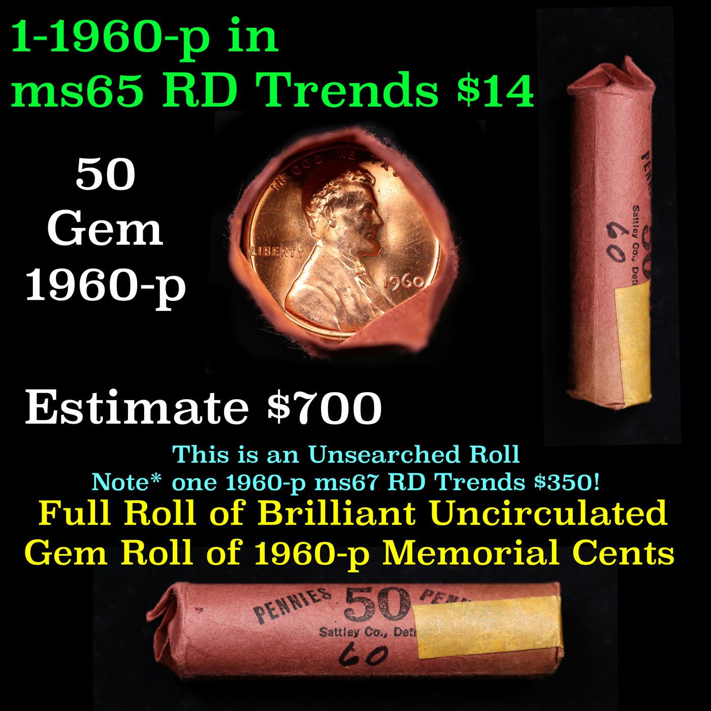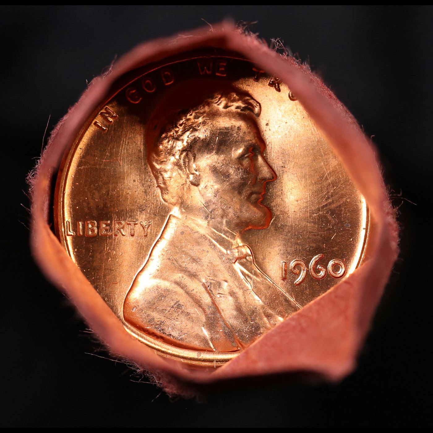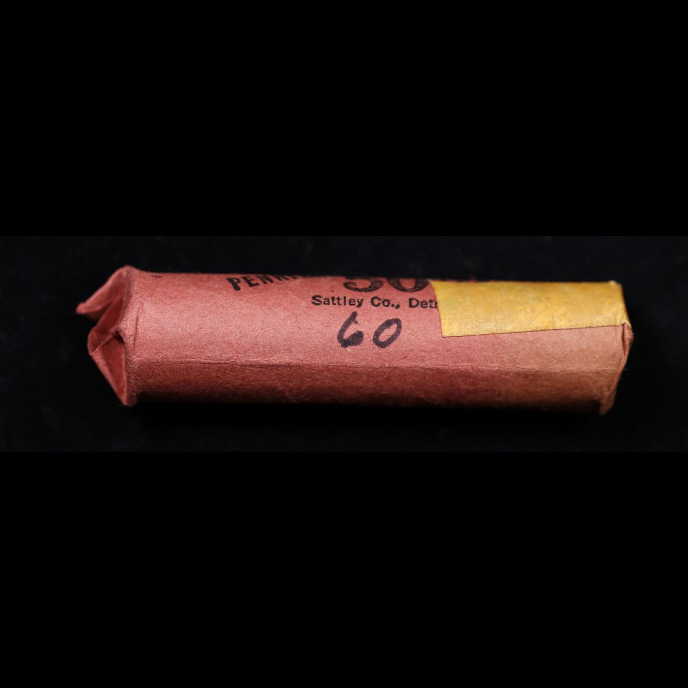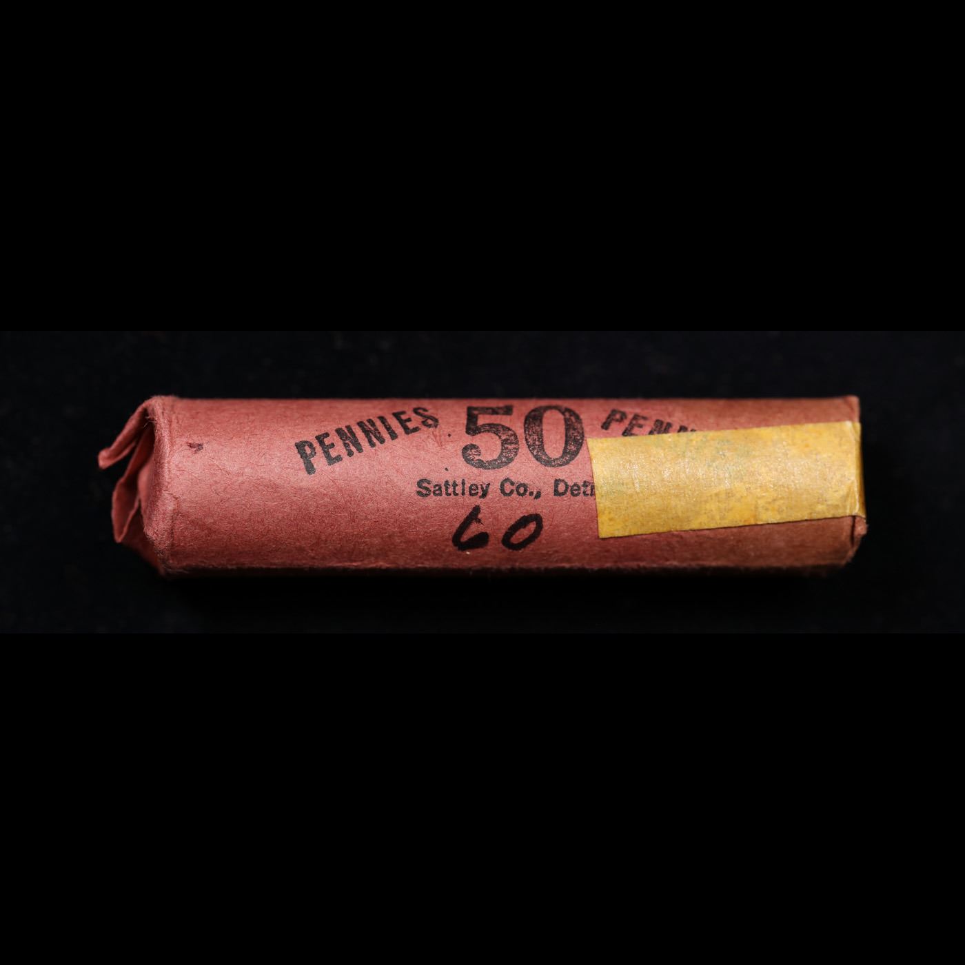 Lincoln 1c roll, 1960-p 50 pcs Sattley Co. Wrapper.. A terrific roll of Lincoln cents. Most if not all coin should be cherry red. Trends ms65 rd $14