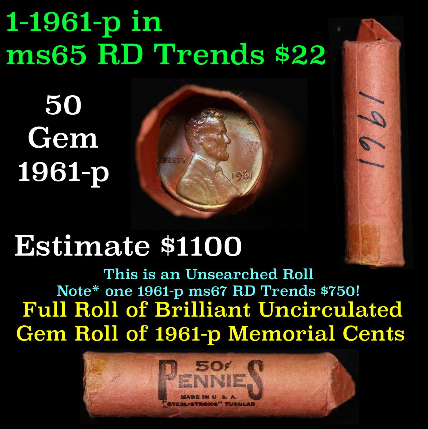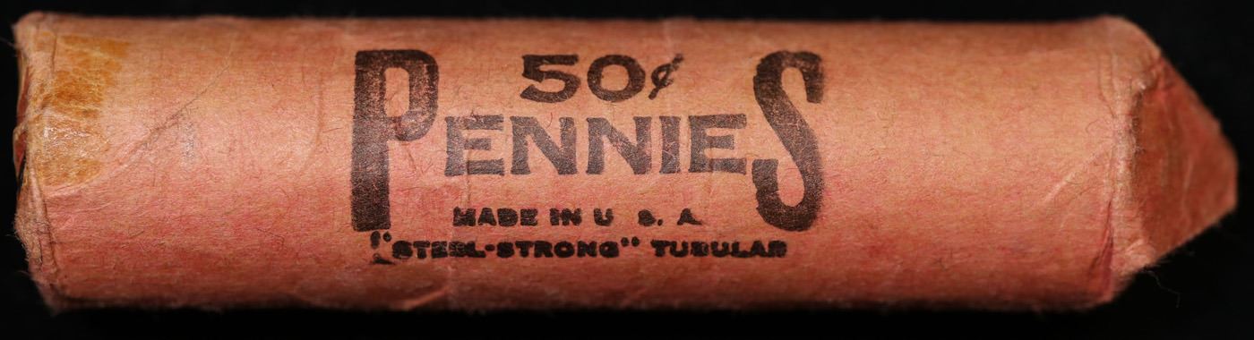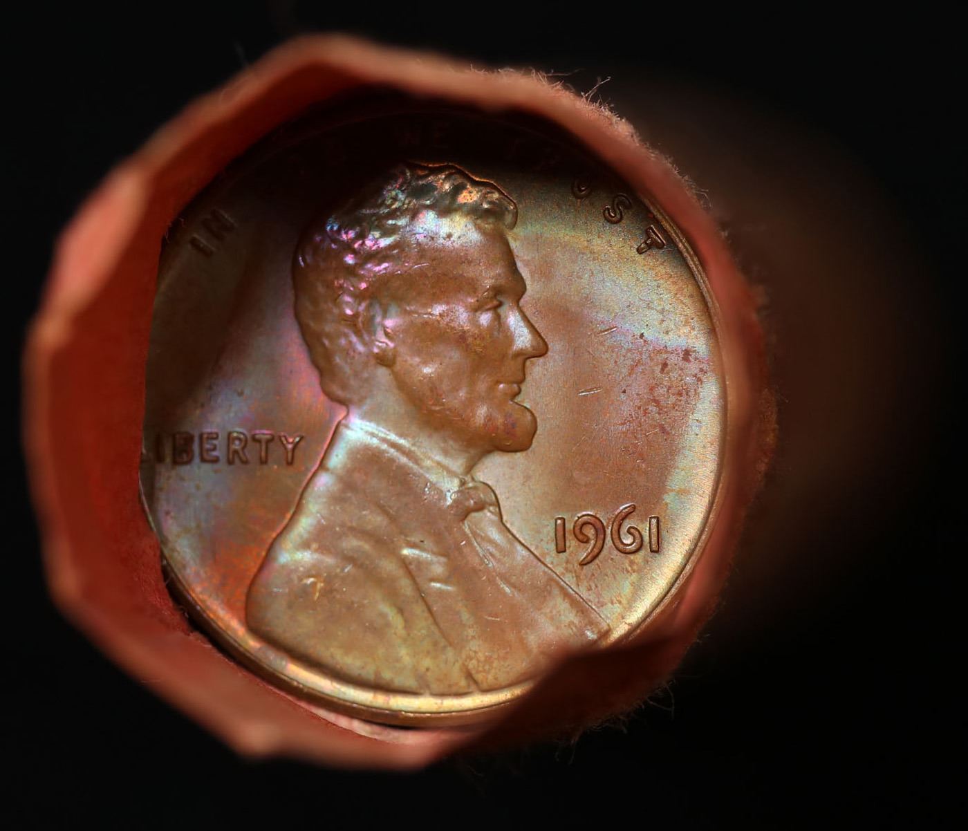 Lincoln 1c roll, 1961-p 50 pcs Vintage "Steel-Strong" Tubular Wrapper.. A terrific roll of Lincoln cents. All coins appear to be cherry red. Trends ms65 rd $20