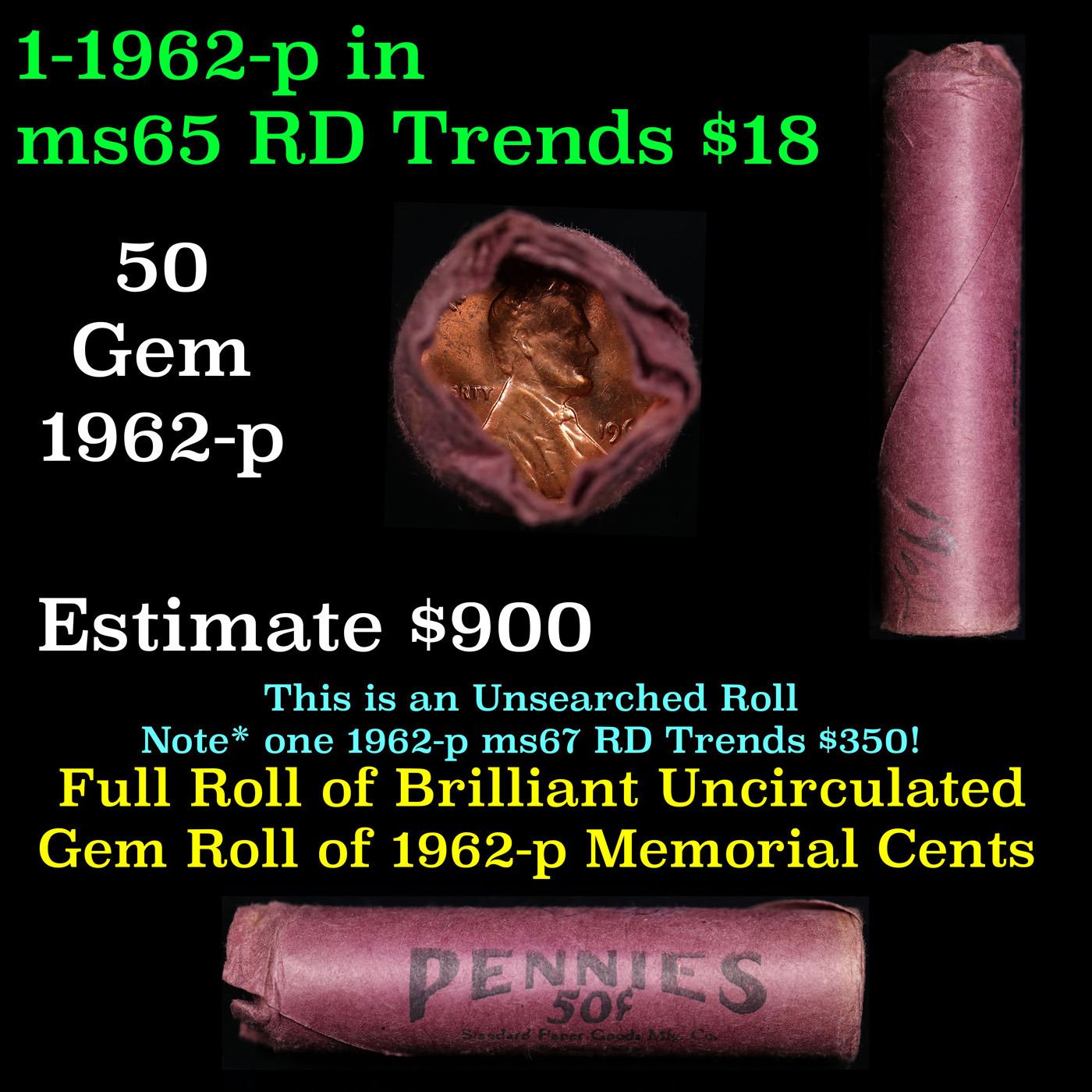 Lincoln 1c roll, 1962-p 50 pcs Standard Paper Good Mfg. Co. Wrapper.. A terrific Shotgun roll of Lincoln cents. Most if not all coin should be cherry red. Trends ms65 rd $15